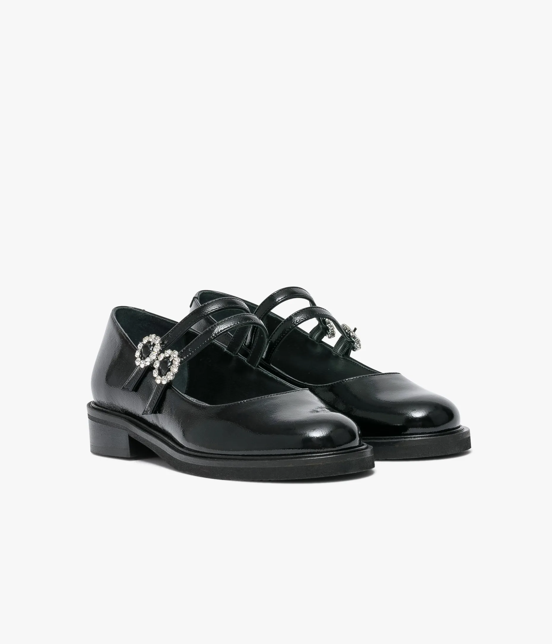 Une babies en cuir verni noir fabriquée avec soin au Portugal. Cette chaussure mixe avec brio une inspiration rétro à des détails glamour avec ses fines brides fermées par des boucles en strass et sa semelle intérieure argentée. Elle repose sur une épaisse semelle avec trépointe fantaisie et large talon confortable. Une chaussure entièrement doublée cuir avec semelle intérieure cuir dotée d'une fine mousse. Ce cuir Naplak particulièrement souple peut présenter un aspect légèrement froissé. Elastiques d'aisance sous les boucles.
