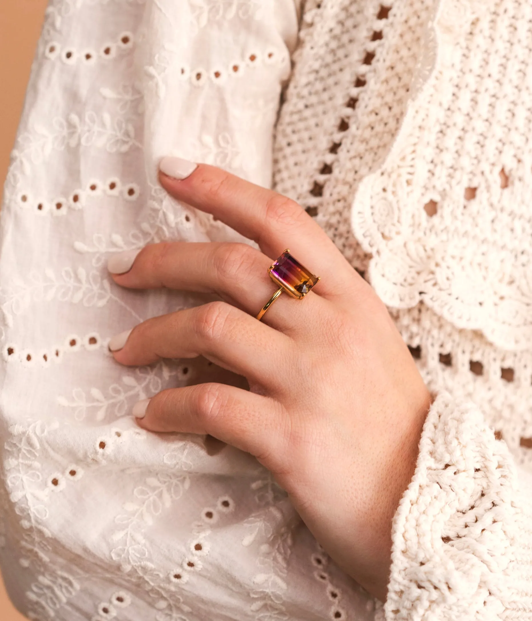 Une jolie bague dorée surmontée d’une large pierre en verre violet et ocre affichant un bel effet de dégradé. Une bague en acier inoxydable, un alliage hypoallergénique qui ne change pas de couleur, ne ternit pas et s’entretient facilement. Existe en 2 tailles. Dimensions de la pierre : 1,4 x 1 cm.