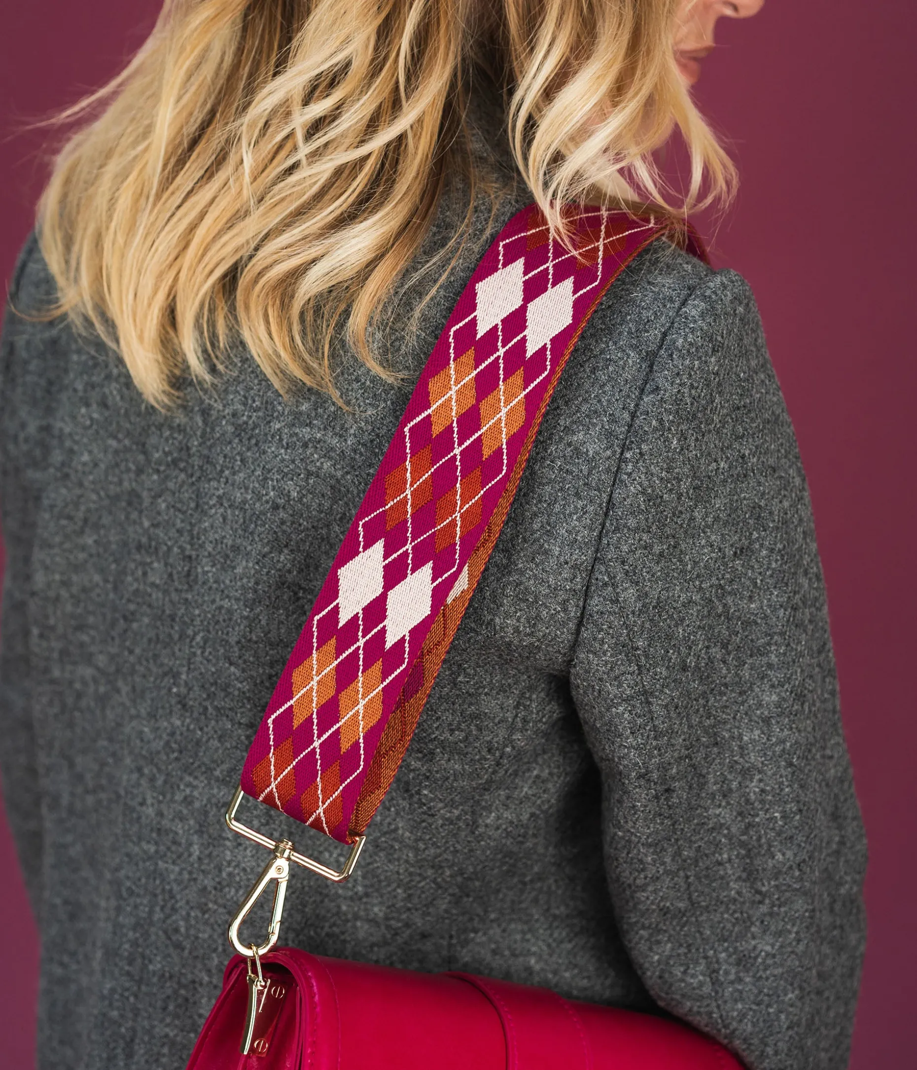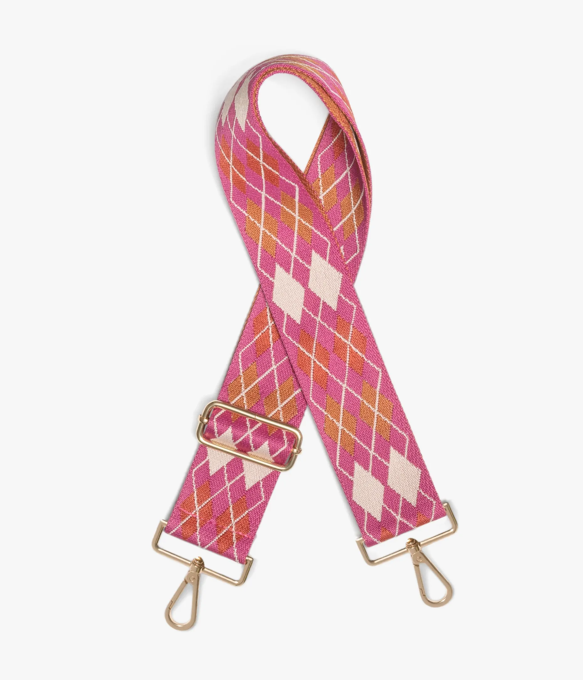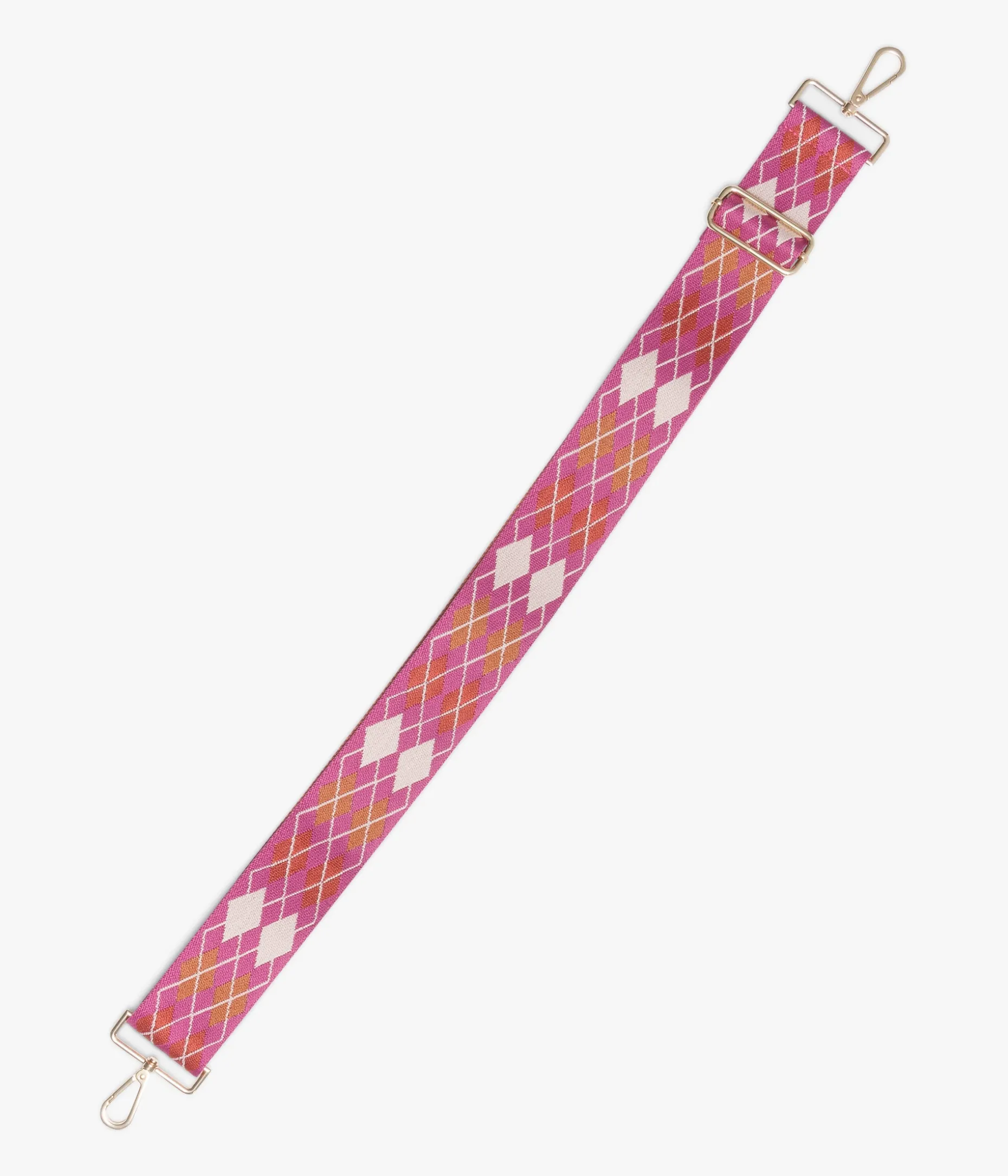 Cette bandoulière de sac fuschia à motifs losanges beige et marron, apportera une touche de couleur pétillante à vos sacs. Confectionnée dans une toile ultra résistante, elle se fixe grâce à des mousquetons dorés sur tous vos sacs, depuis le sac à main jusqu’à la pochette d’ordinateur. Bandoulière ajustable en longueur. Largeur 5 cm. Longueur max : 122 cm.