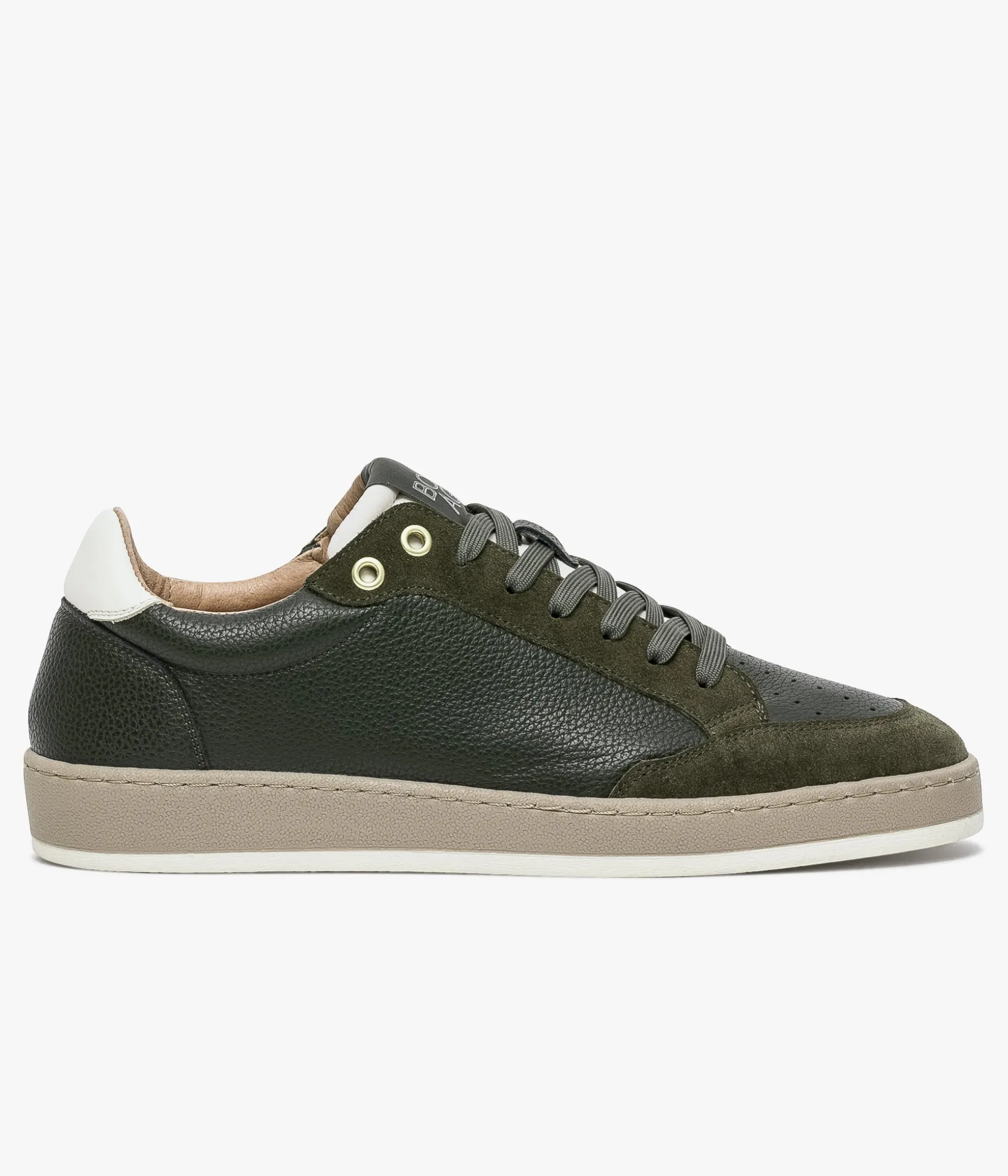 Une basket kaki en cuir grainé fabriquée avec soin au Portugal. Elle est agrémentée de touches de cuir velours ton sur ton et rehaussée d'un patch en cuir blanc au talon et d’une languette en toile assortie. Une sneaker partiellement doublée cuir avec semelle intérieure cuir amovible ultra confortable. Elle est posée sur une épaisse semelle en caoutchouc grège. Cette paire bénéficie d’un cousu latéral qui consiste à relier la tige et la semelle. Cette technique apporte une réelle robustesse et souplesse au produit. Col et languette rembourrés pour plus de confort. Fermeture par lacets plats kaki.