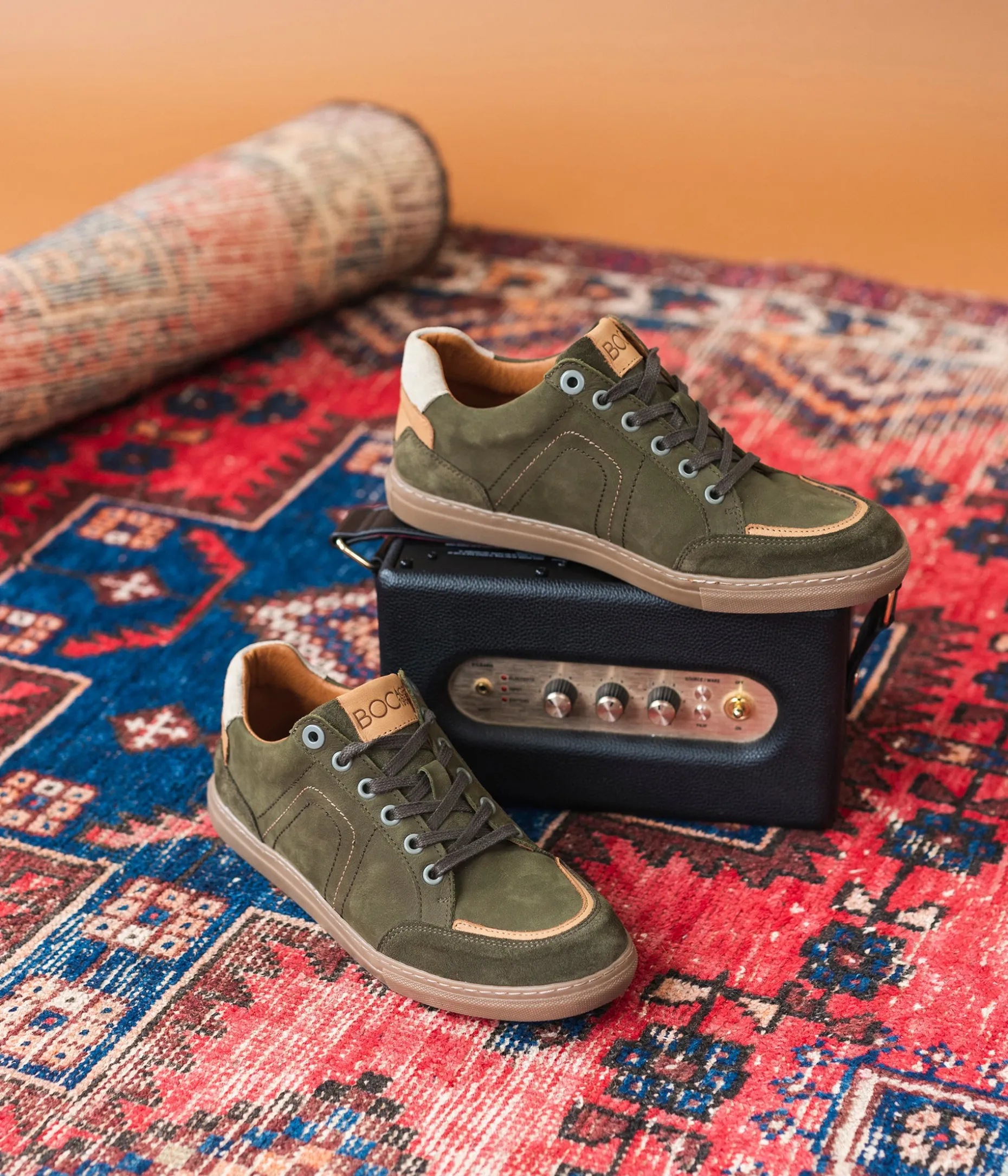 Basket kaki en cuir velours et nubuck. Une basket kaki qui joue sur le mélange des matières. Son dessus en nubuck est agrémenté de touches de cuir velours ton sur ton, d’un patch écru au talon et d’empiècements en cuir lisse camel. Cette chaussure possède la technologie brevetée Bocage Innovation, ainsi votre chaussure s'adaptera aux largeurs de votre pied et vous garantira un bien-être inédit. La tige et la semelle sont renforcées grâce au cousu latéral. Ce cousu est un gage de qualité quant à sa fabrication et à sa durabilité. Elle se ferme par lacets plats kaki qui coulissent dans des œillets verts. Basket entièrement doublée cuir avec semelle intérieure cuir amovible. Languette et contrefort rembourrés. Tige 5 cm. Semelle 2 cm. On la porte avec un jean retroussé et un pull kaki.