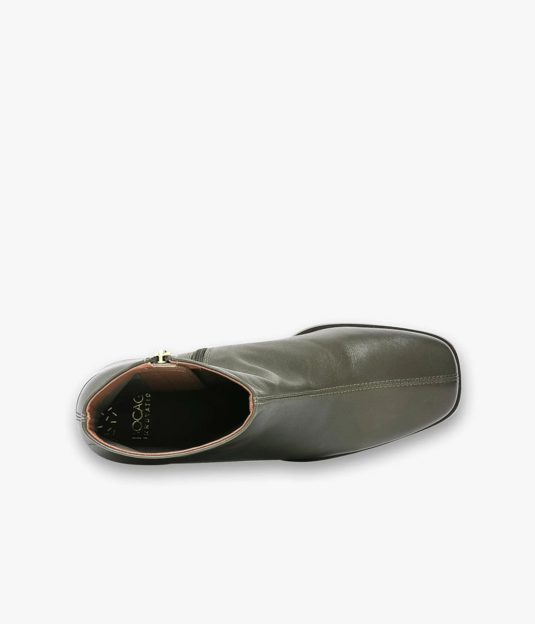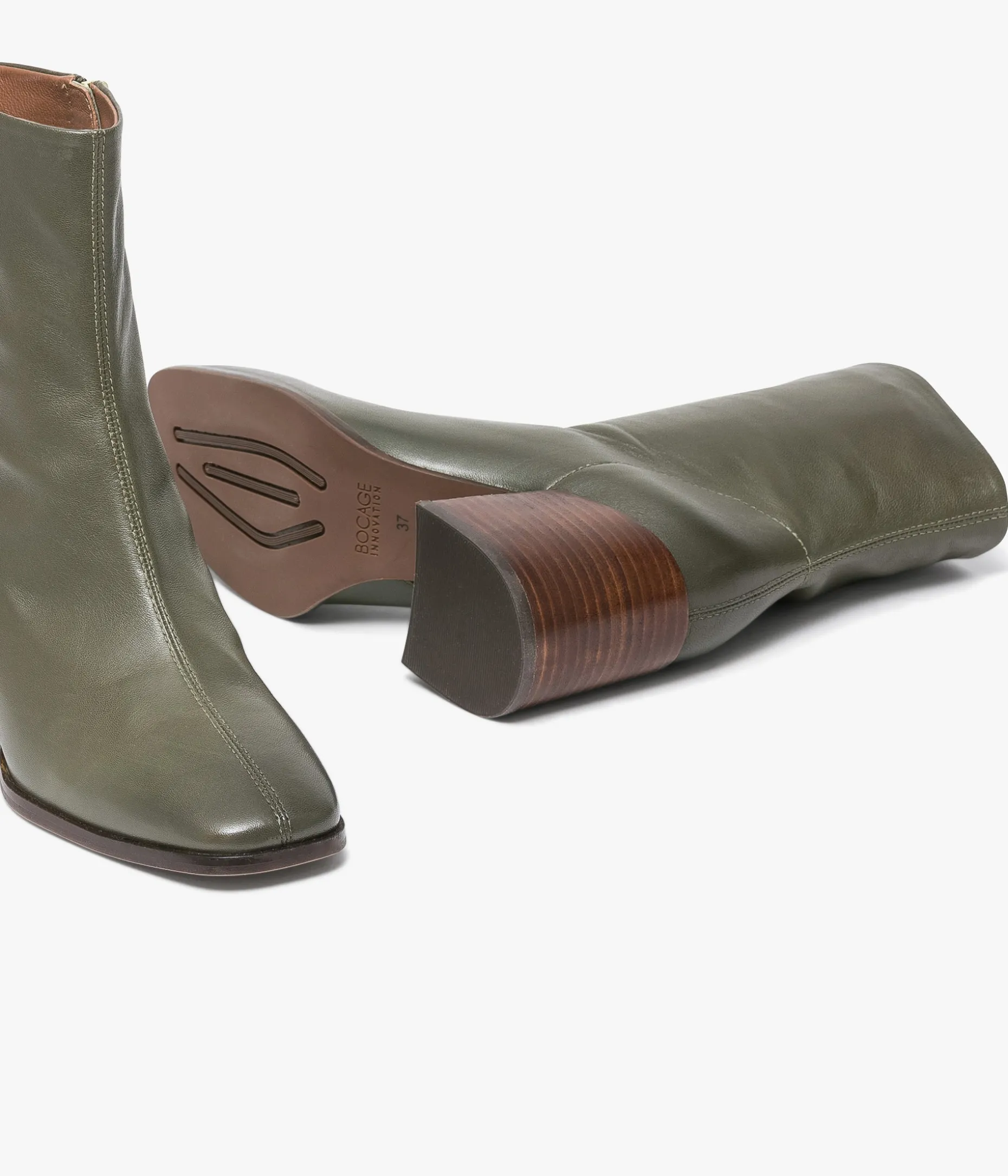 Un boots kaki en cuir lisse fabriqué avec le plus grand soin. Ce boots au look vintage présente un bout carré, une tige souple ajustée à la cheville et un large talon lamellé collé. Une chaussure doublée cuir sur la partie pied avec semelle intérieure cuir dotée d’une fine mousse. Notre technologie Bocage Innovation vous garantit un bien-être inégalé. La semelle dissimule des élastiques qui permettent à votre chaussure de s’adapter à votre pied. Fermeture par zip intérieur.