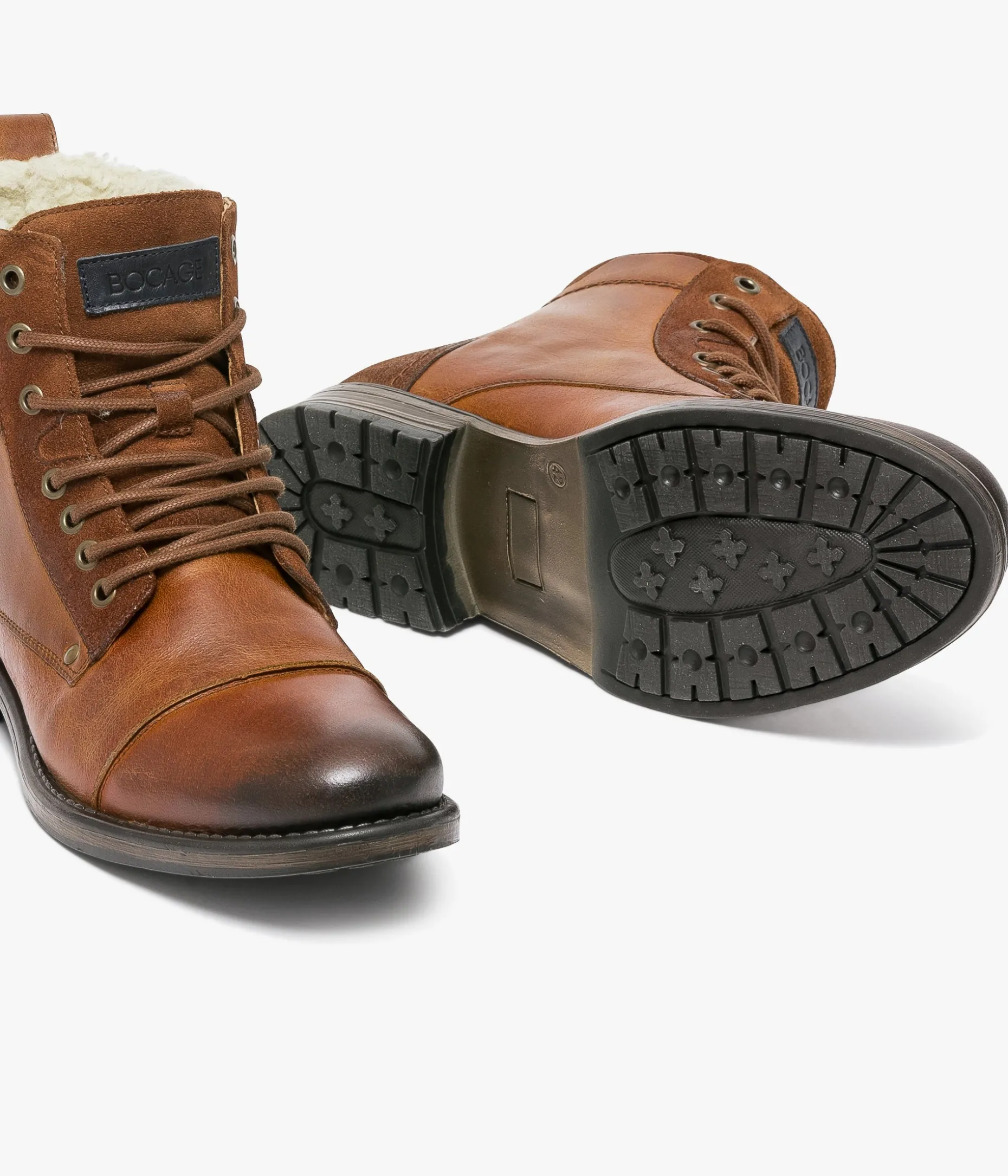 Un boots cognac en cuir lisse fabriqué avec grand soin au Portugal. Ce boots affiche un effet légèrement patiné sur le bout du pied avec surpiqûre en relief. Il est rehaussé de touches de cuir velours au talon, sur la languette et sur les garants. Sa tige est doublée d’un textile confortable imitation laine de mouton. Un boots homme avec semelle intérieure cuir dotée d’une fine mousse. Logo en cuir marine cousu sur la languette. Fermeture par lacets ronds. Il repose sur une semelle crantée avec trépointe fantaisie.