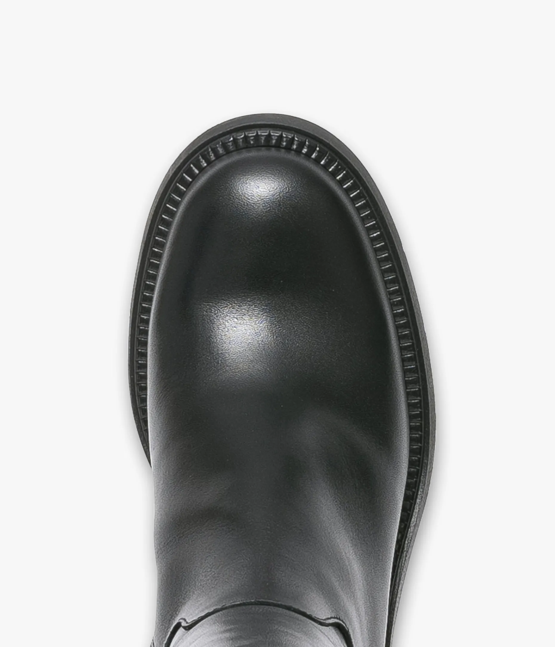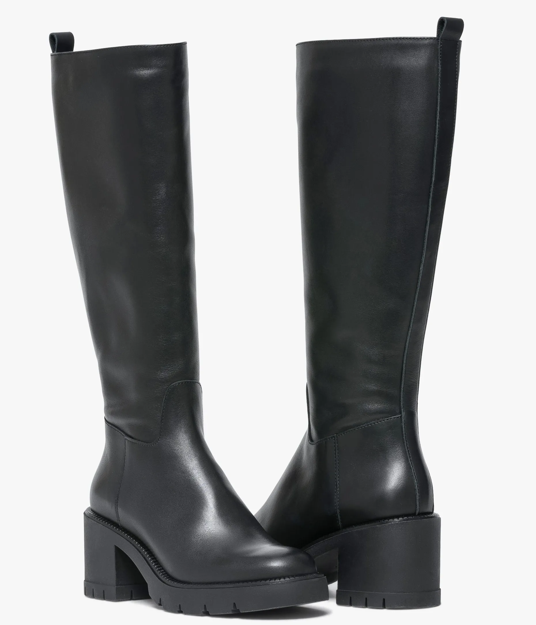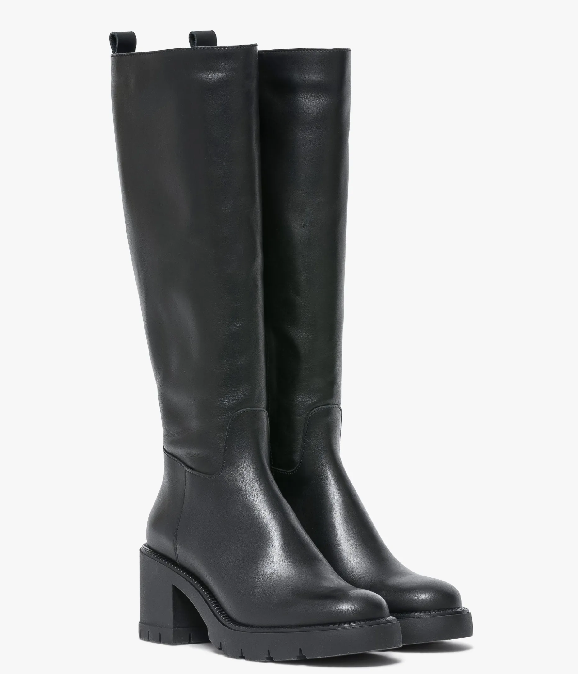 Une botte noire en cuir lisse fabriquée avec soin au Portugal. Une botte élégante avec bout amande et tige ajustée au mollet posée sur une épaisse semelle avec trépointe cuir ciselée qui lui donne une allure résolument contemporaine. Cette chaussure est entièrement doublée textile avec semelle intérieure cuir dotée d’une fine mousse. Elle se ferme par zip intérieur et possède un élastique d’aisance en haut de la tige. Semelle : 2 cm. Tour de mollet : 38 cm.
