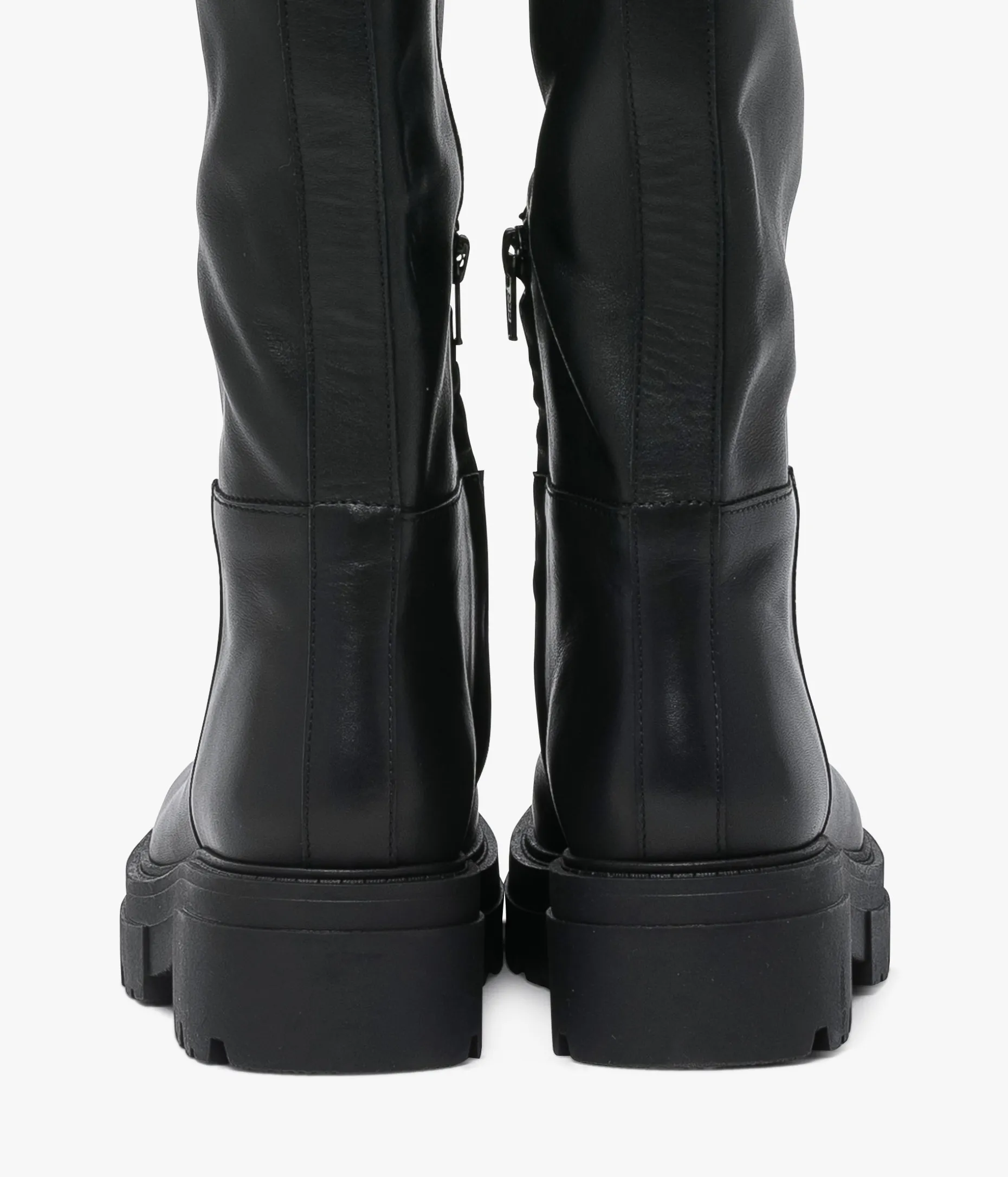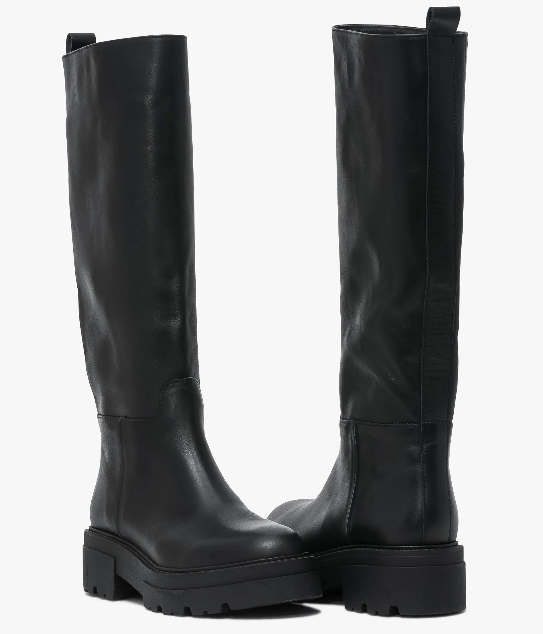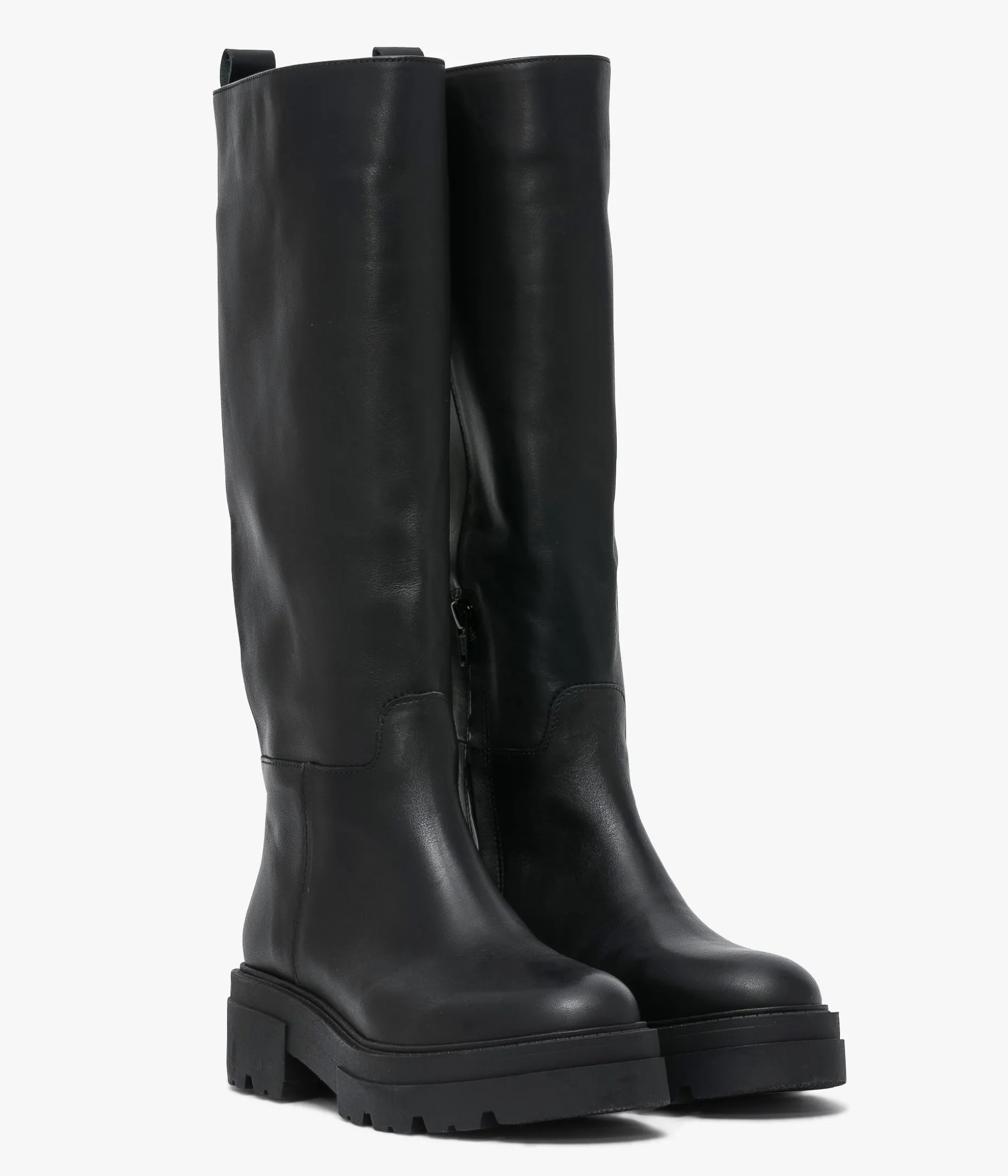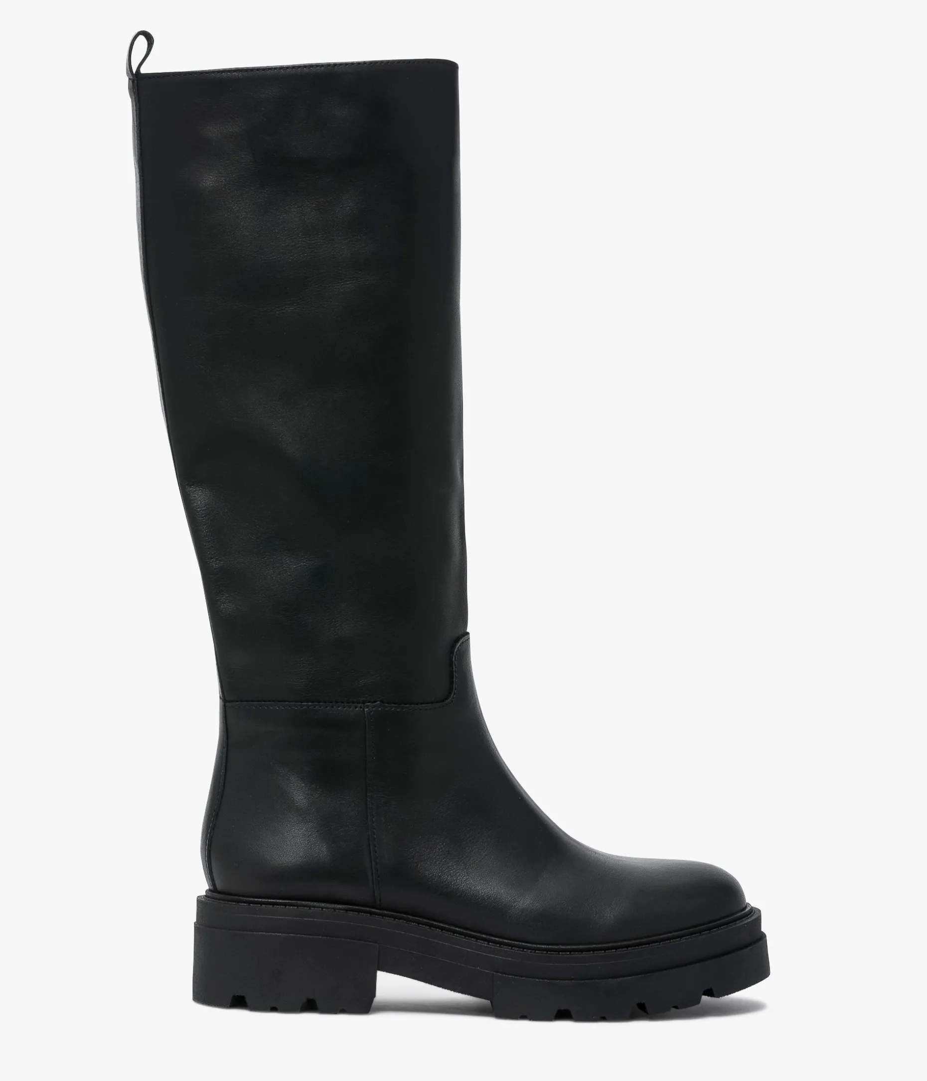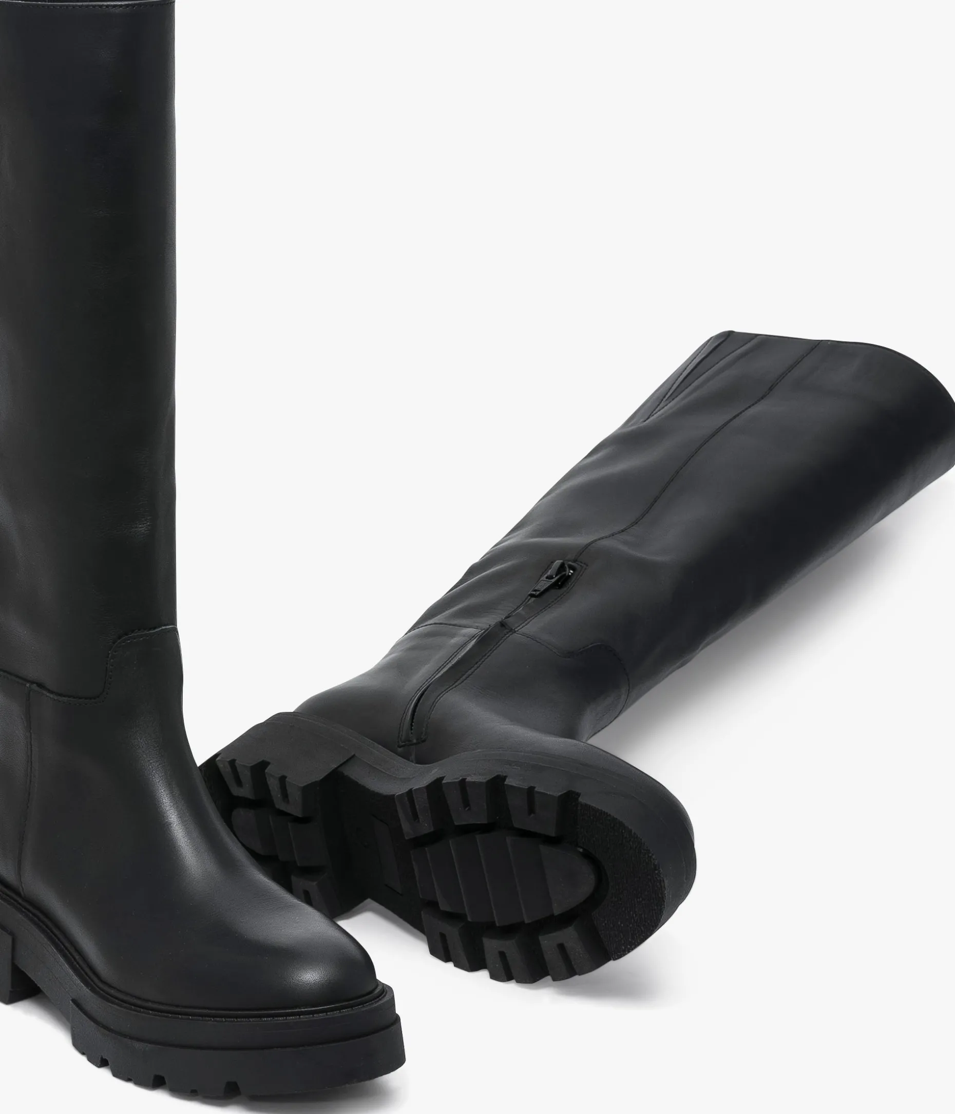 Une botte en cuir noir fabriquée avec soin au Portugal. Cette botte cavalière à bout amande affiche un look sobre, chic et intemporel, twisté par une imposante semelle crantée. Une botte doublée cuir sur la partie pied avec semelle intérieure cuir et tige non doublée pour plus de souplesse. Elle se ferme par un demi-zip au niveau de la cheville et possède un élastique d’aisance en haut de la tige. A noter, sa tirette à l'arrière du pied qui facilite le chaussant. Semelle 3 cm. Tour de mollet 37 cm. Une botte à porter avec un jean slim comme avec une robe.