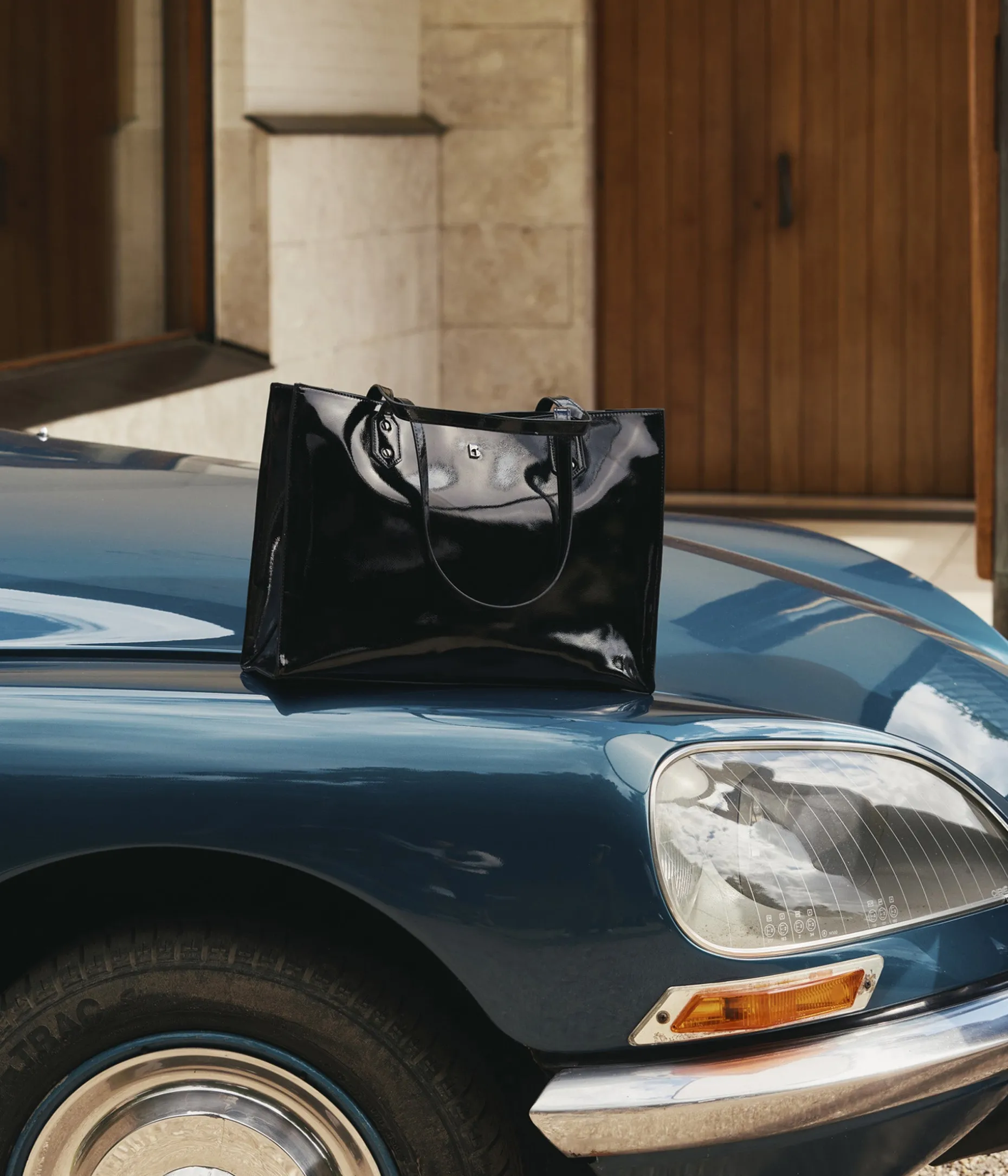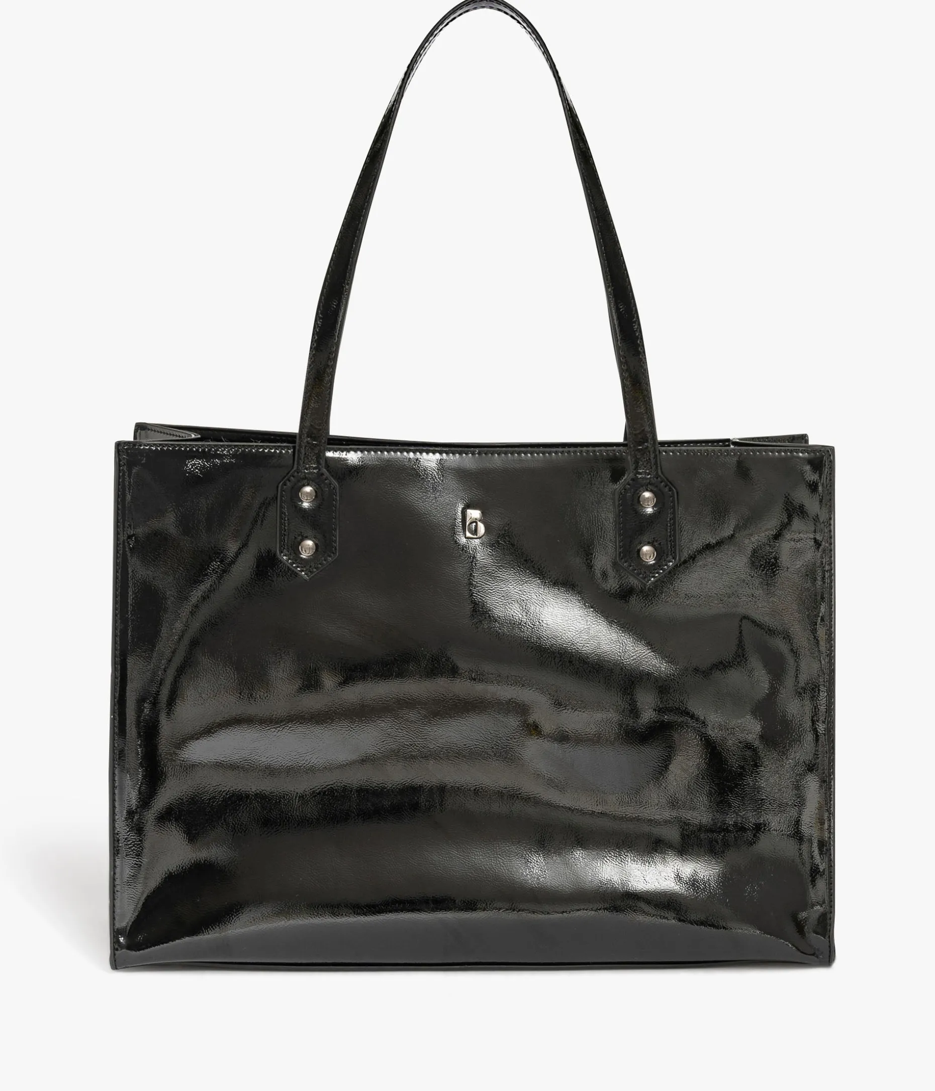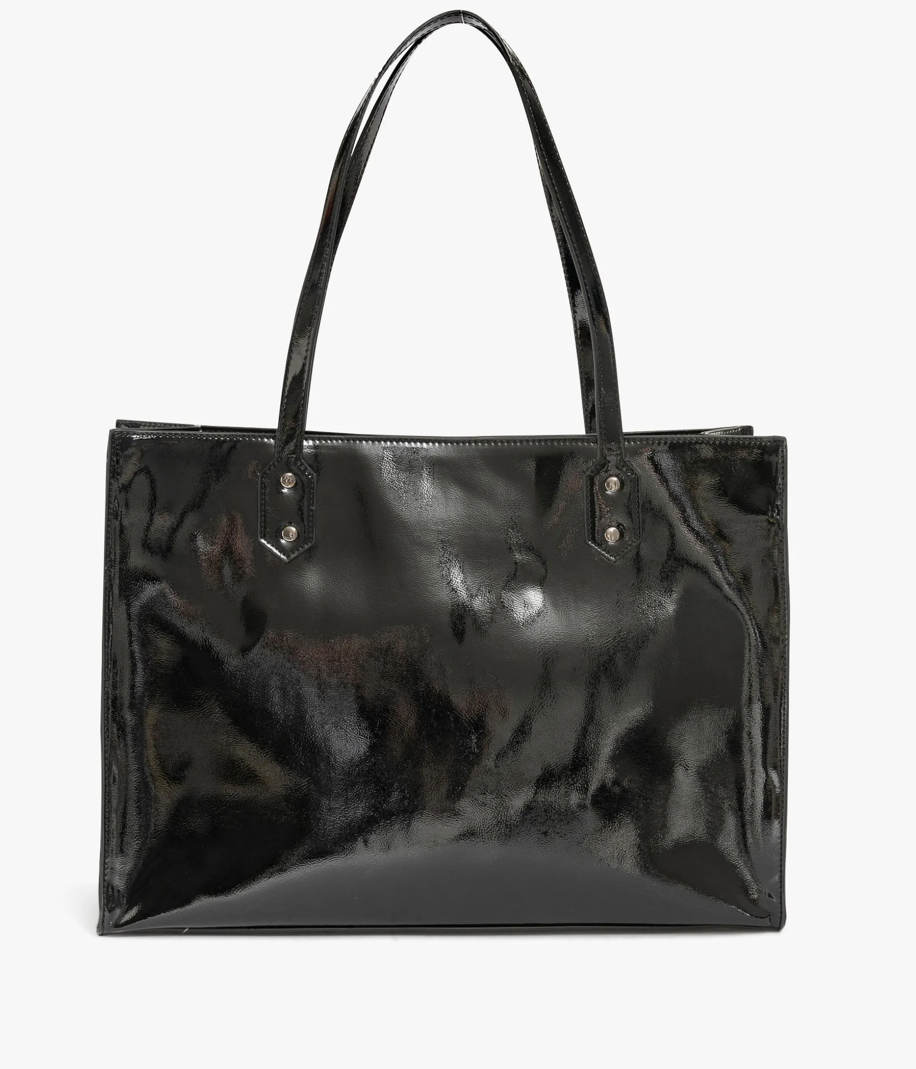 Un sublime sac cabas en matière vernie orné d’un logo métallique argenté et de clous assortis sur les pattes de fixation des anses. Ce sac rectangle possède un grand compartiment, une poche plaquée et une pochette zippée. Son fond rigide, protégé par des clous métalliques, lui assure une parfaite tenue. Il se ferme par zip sur le dessus pour une meilleure protection de vos affaires personnelles. Dimensions : H28*L39*P12 cm.