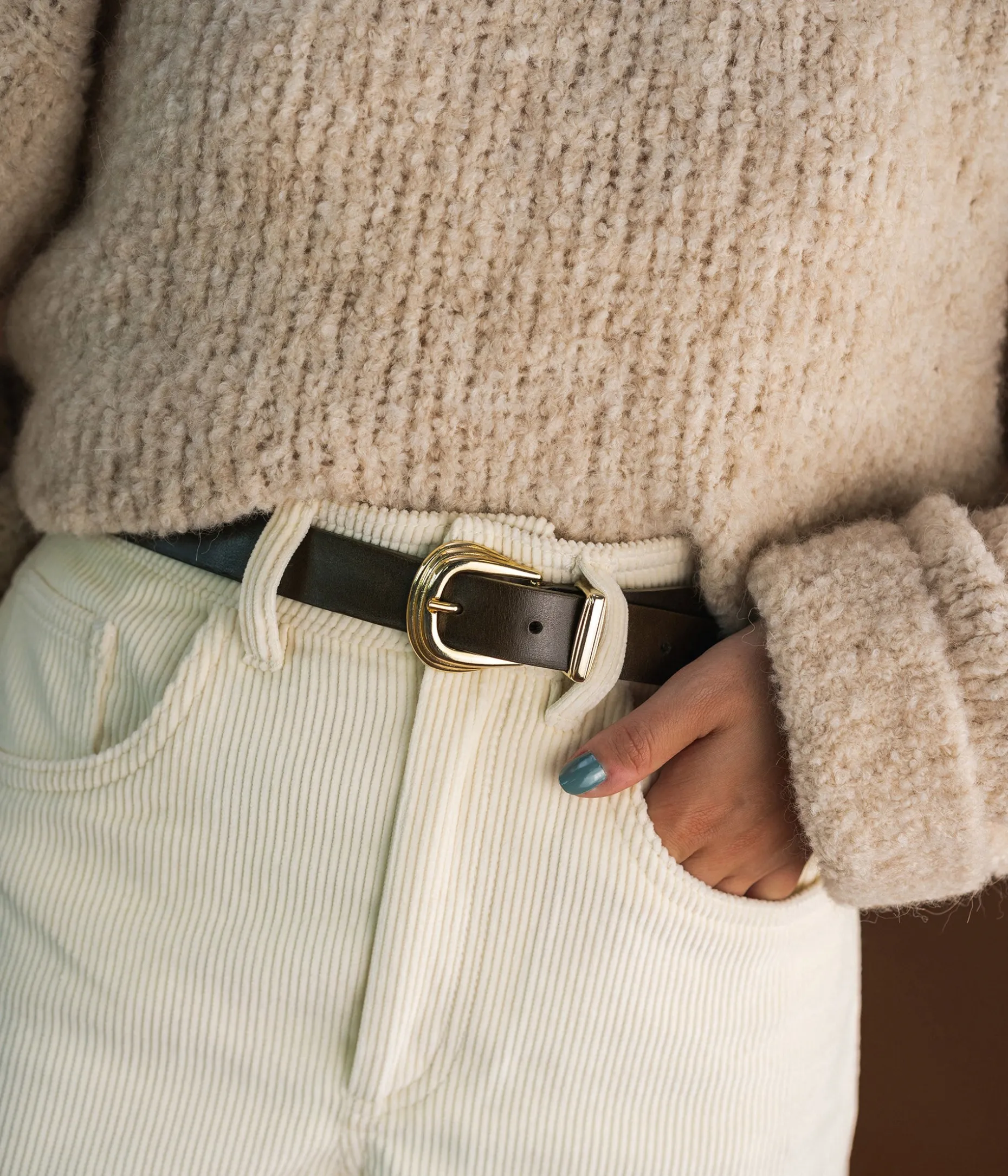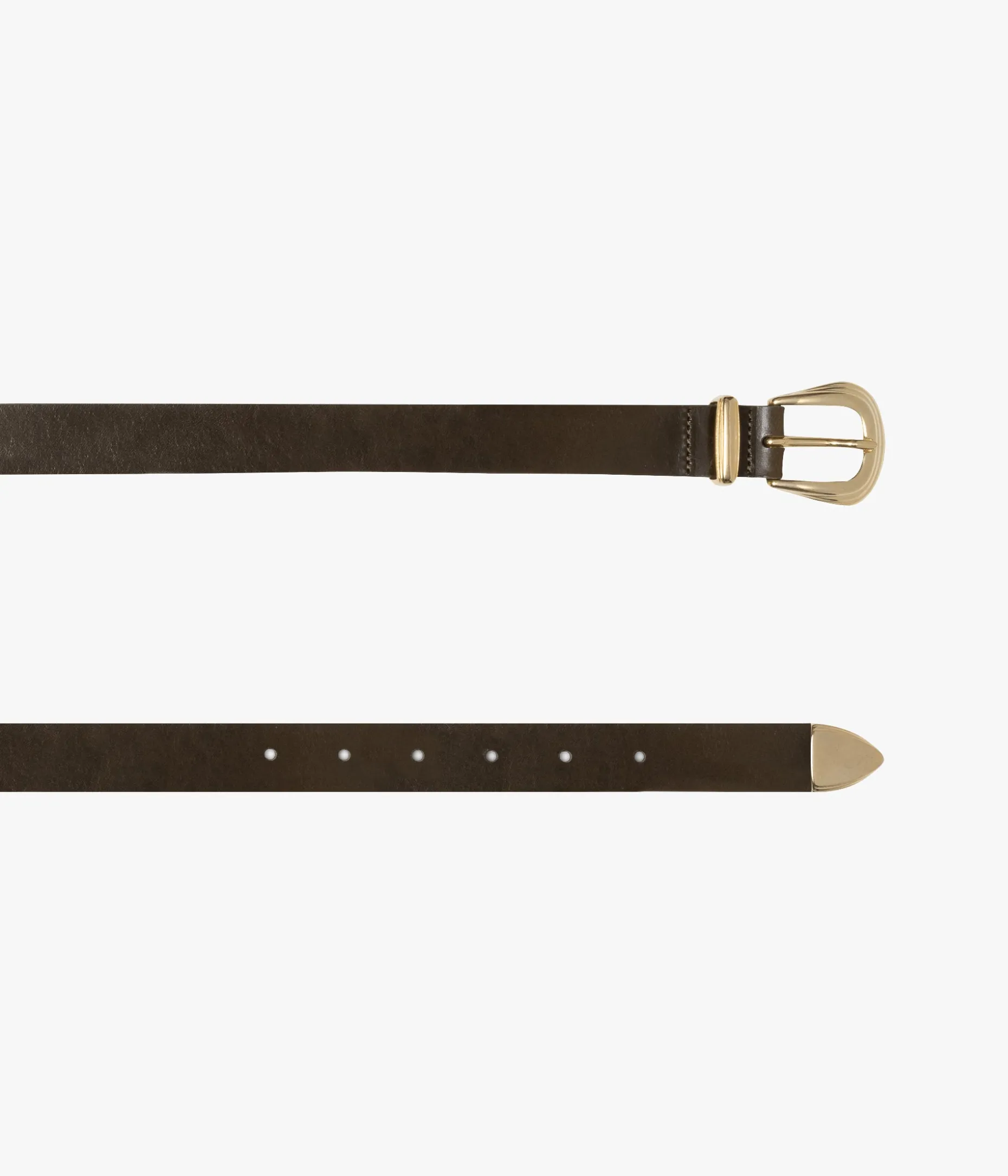 Une jolie ceinture kaki fabriquée en France. Une ceinture femme en cuir lisse, entièrement doublée cuir, fermée par une élégante boucle en métal doré, avec passant et bout assorti. Largeur : 2,4 cm.