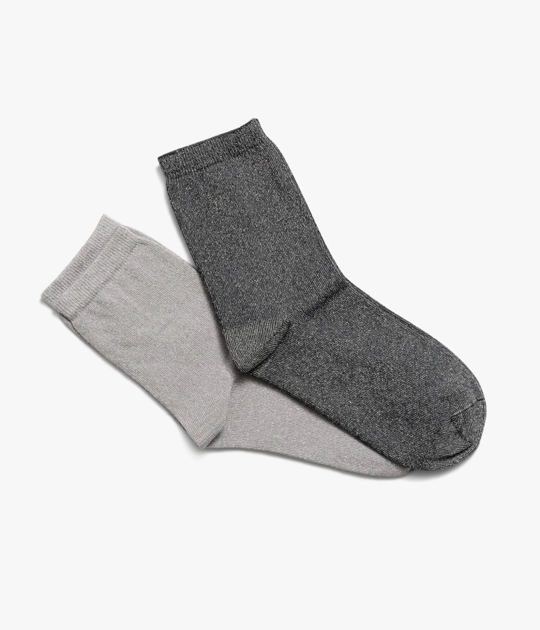Un lot de deux paires de chaussettes femme incrustées de paillettes. Des chaussettes scintillantes qui ajouteront une touche glamour à toutes les tenues de la saison. Ce lot se compose d’une paire noire et d’une paire grise illuminées par des fils argentés. Ces chaussettes à tige courte possèdent un bord-côte élastiqué en haut de la tige. Chaussettes certifiées BSCI et Oeko-Tex.