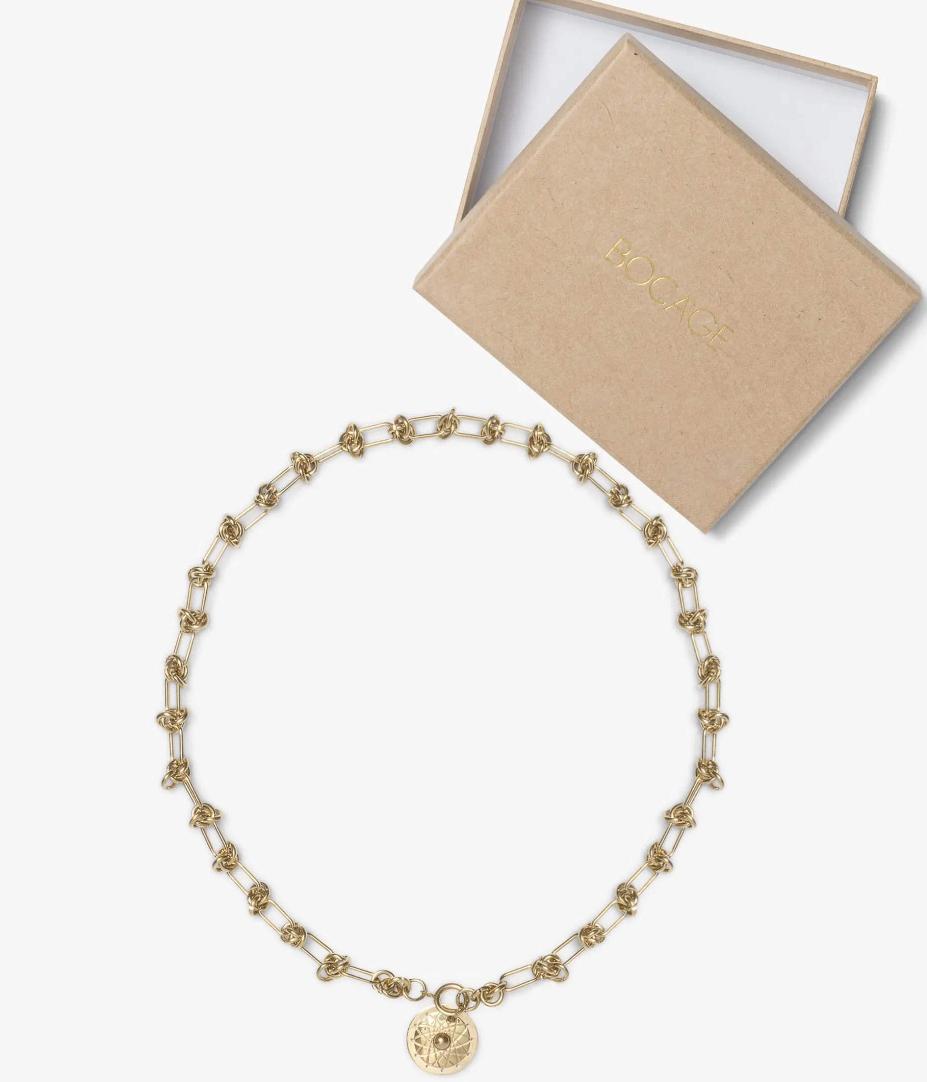 Un collier doré très original avec ses mailles fantaisie. Des mailles allongées sont associées à de petites mailles rondes entrelacées pour un effet « noué » surprenant. Ce collier est en acier inoxydable, un alliage hypoallergénique qui ne change pas de couleur, ne ternit pas et s’entretient facilement. Le dernier maillon de cette chaîne dorée est orné d’une médaille fantaisie. Fermeture par fermoir rond à bouton poussoir. Longueur 48 cm. Bijou livré dans un coffret.