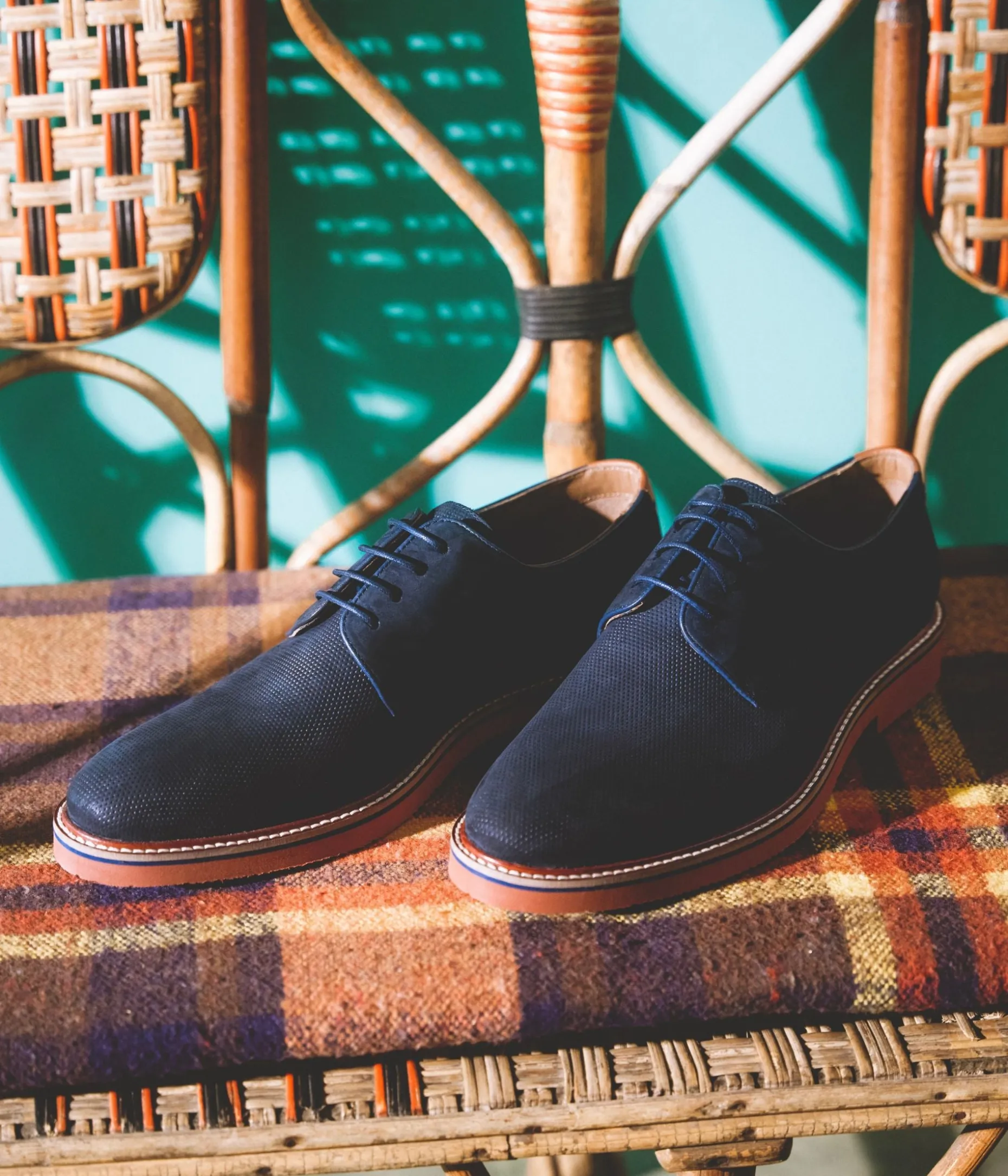 Un derby marine en nubuck fabriqué avec soin. Il affiche un aspect perforé sur l’avant et est agrémenté d’une touche de cuir lisse camel au talon. Une chaussure de ville entièrement doublée cuir avec semelle intérieure cuir dotée d’une fine mousse. Elle est posée sur une épaisse semelle couleur brique très légère, avec trépointe surpiquée. Fermeture par lacets ronds ton sur ton.