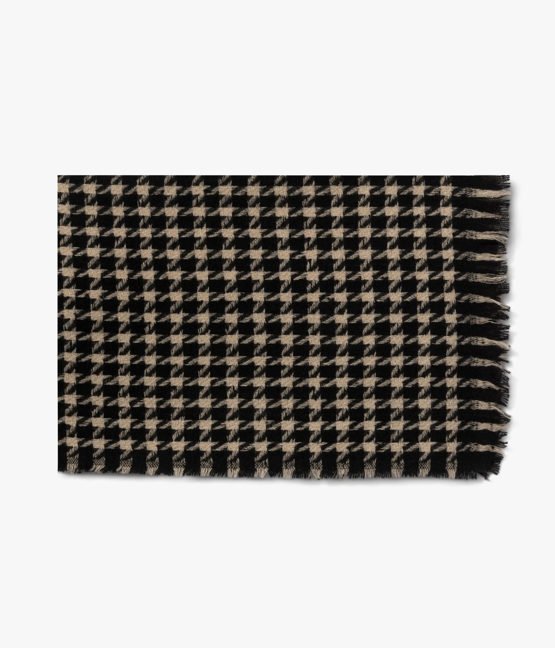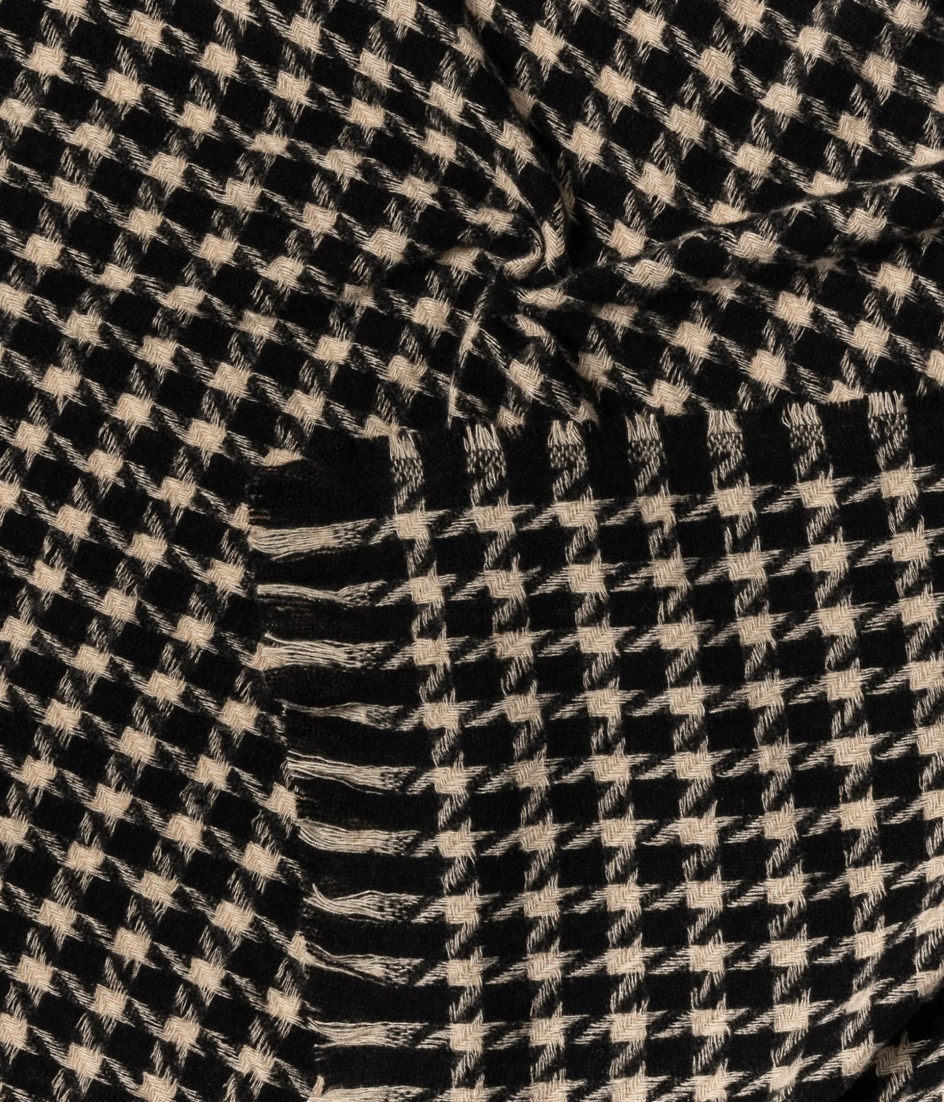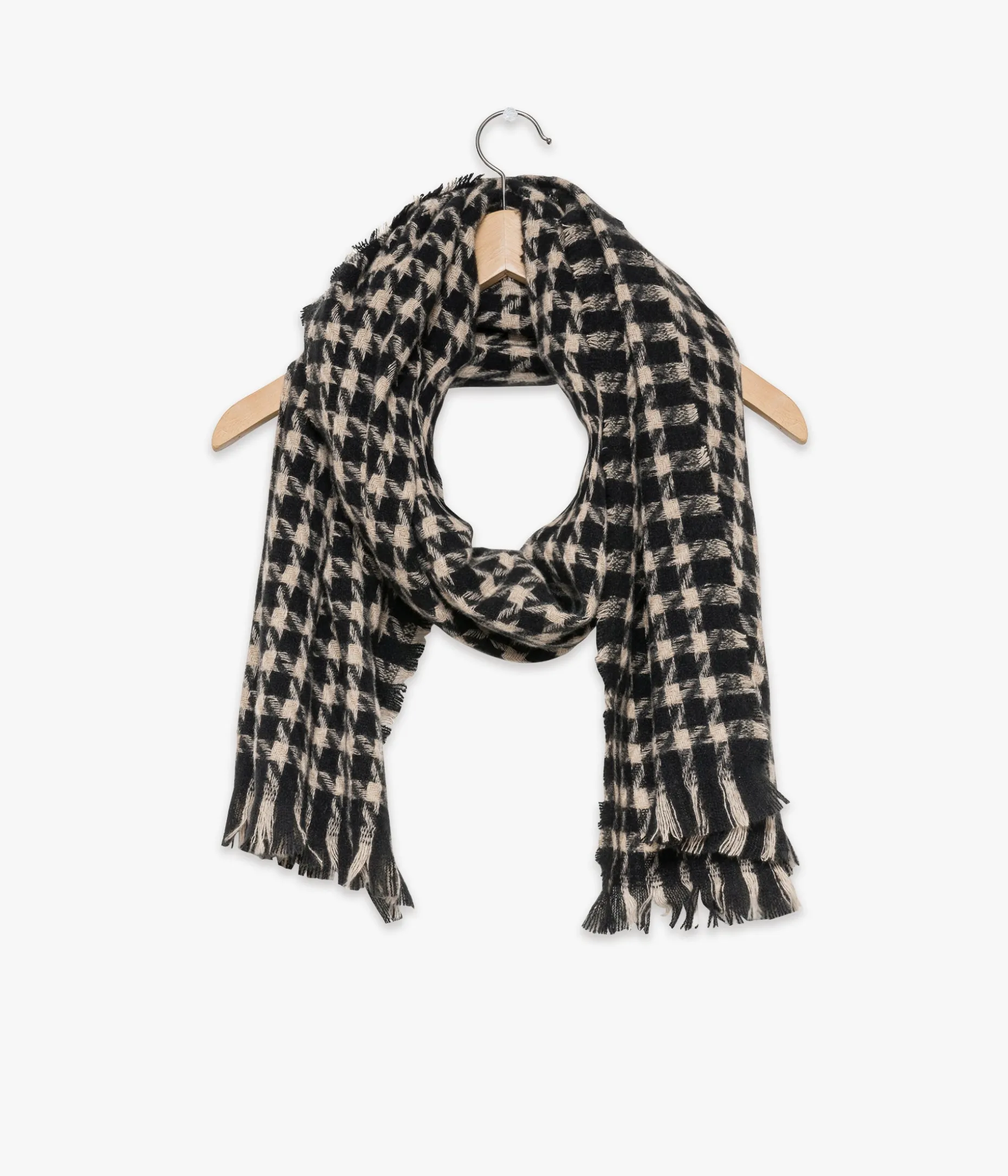 Echarpe à motif pied de coq beige et noir. Une jolie écharpe beige et noir à motif pied de coq idéale pour réchauffer les tenues hivernales en ajoutant une touche tendance. Cette écharpe douce et confortable est agrémentée de franges sur tout le pourtour. Dimensions : 67*200 cm. On l’associe avec un manteau noir ou une veste beige.