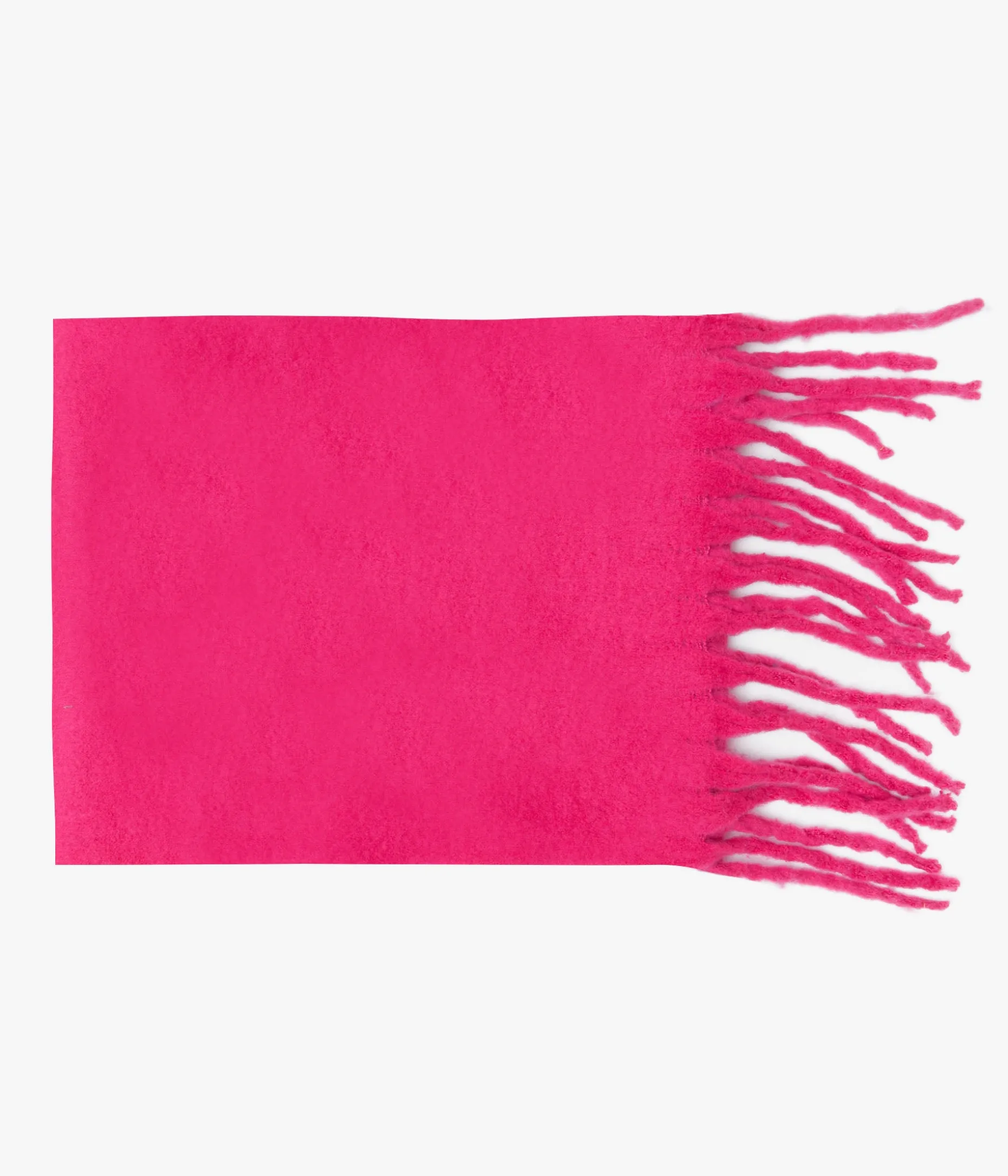 Une magnifique écharpe fuschia idéale pour booster les looks de l’hiver. Une écharpe plaid épaisse et confortable dans laquelle il fait bon s’envelopper. Aux extrémités, de longues franges lui confèrent une touche décontractée. Dimensions : 40×204 cm.