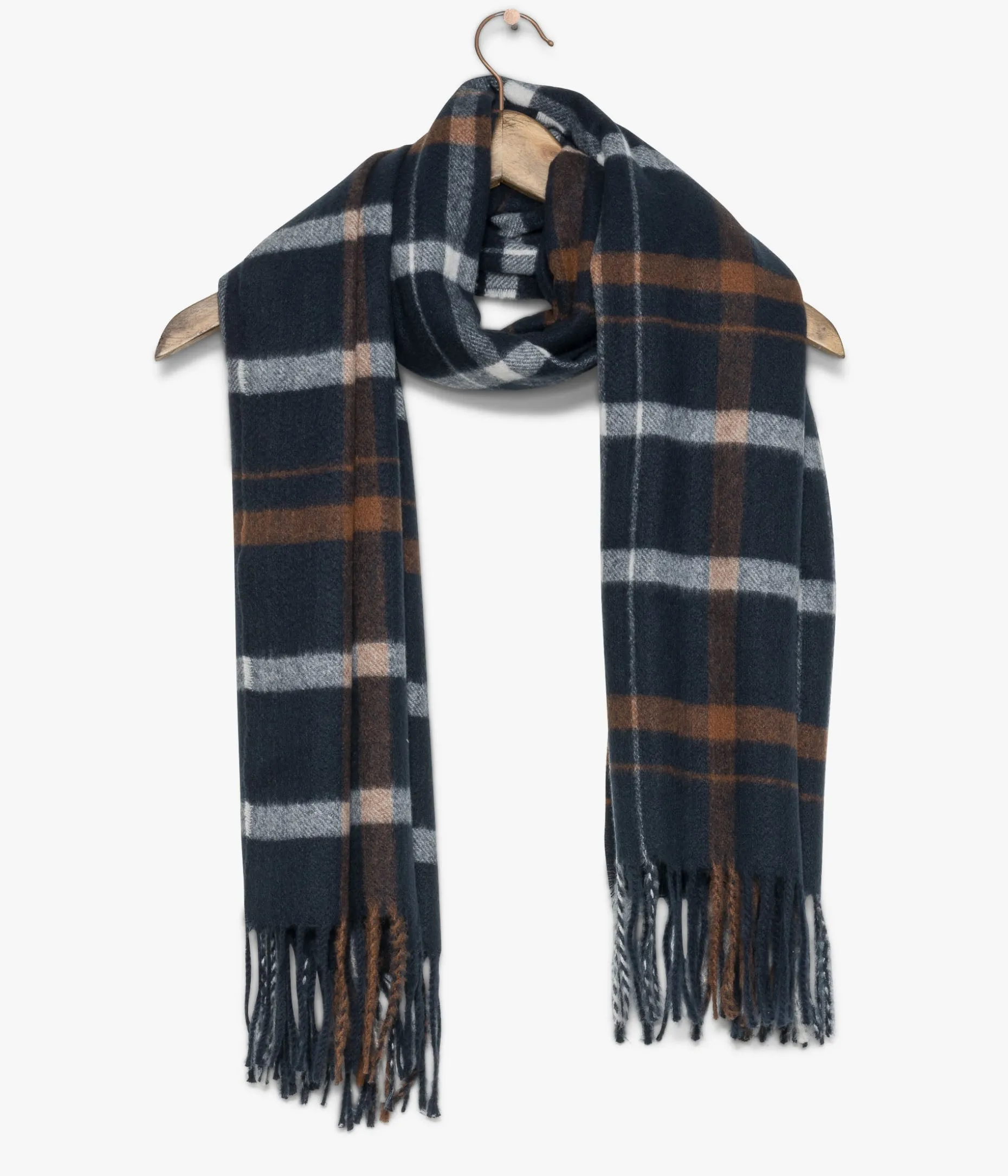 Une écharpe homme marine à carreaux au look intemporel. Déclinée dans un camaïeu de marine, de blanc et de marron, elle accompagnera la plupart des tenues, qu’elles soient chics ou décontractées. Cette écharpe ultra douce est agrémentée de longues franges aux extrémités. Dimensions : 64×190 cm.