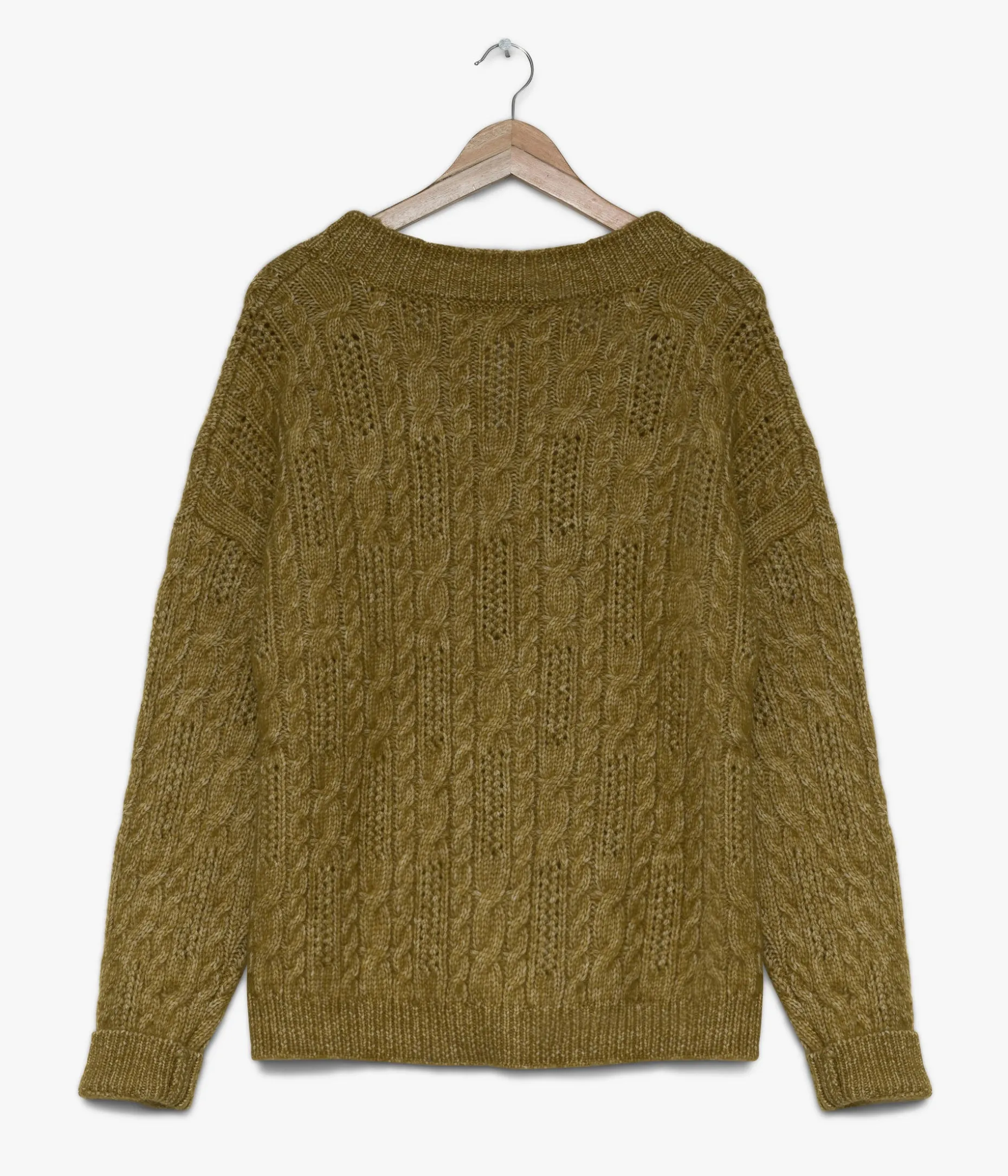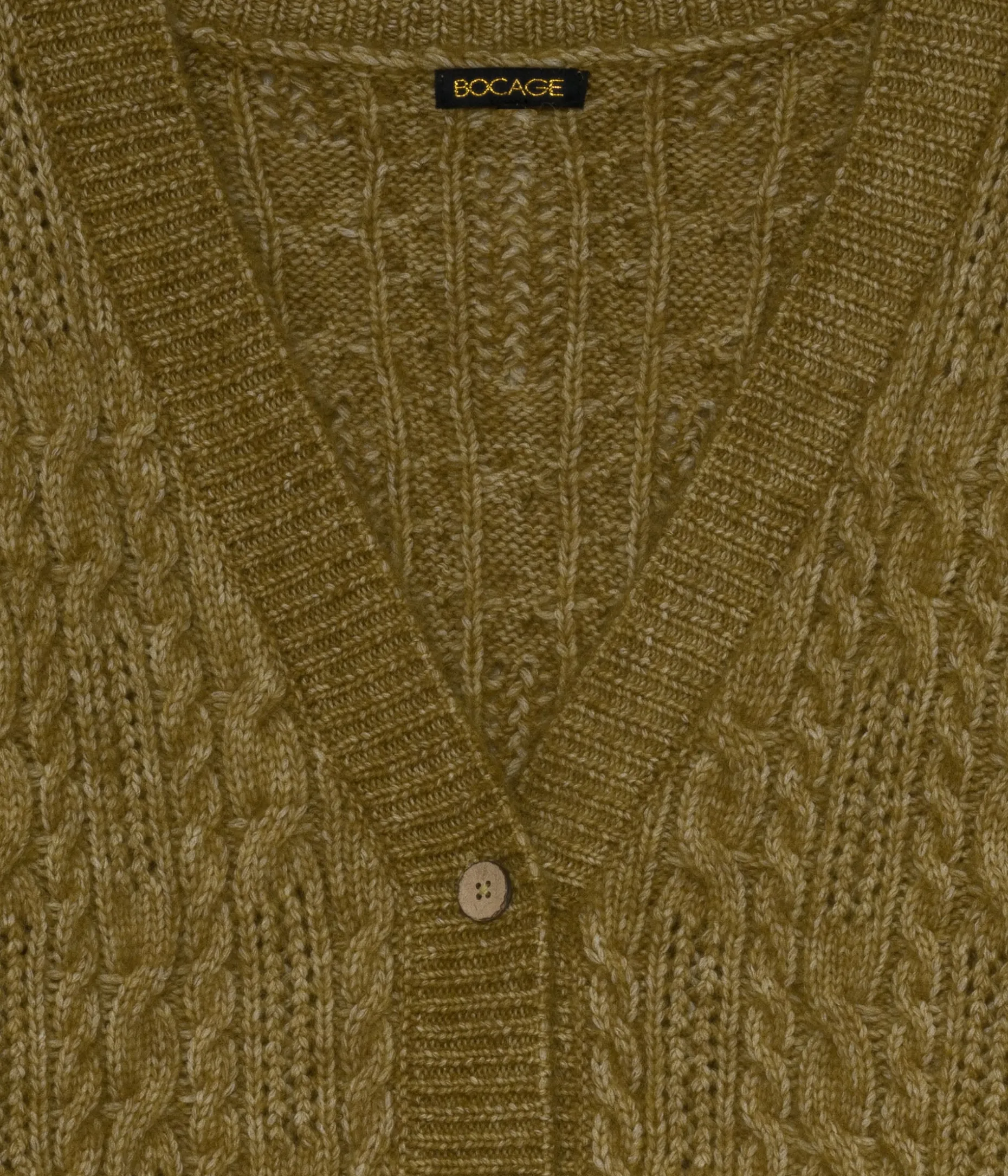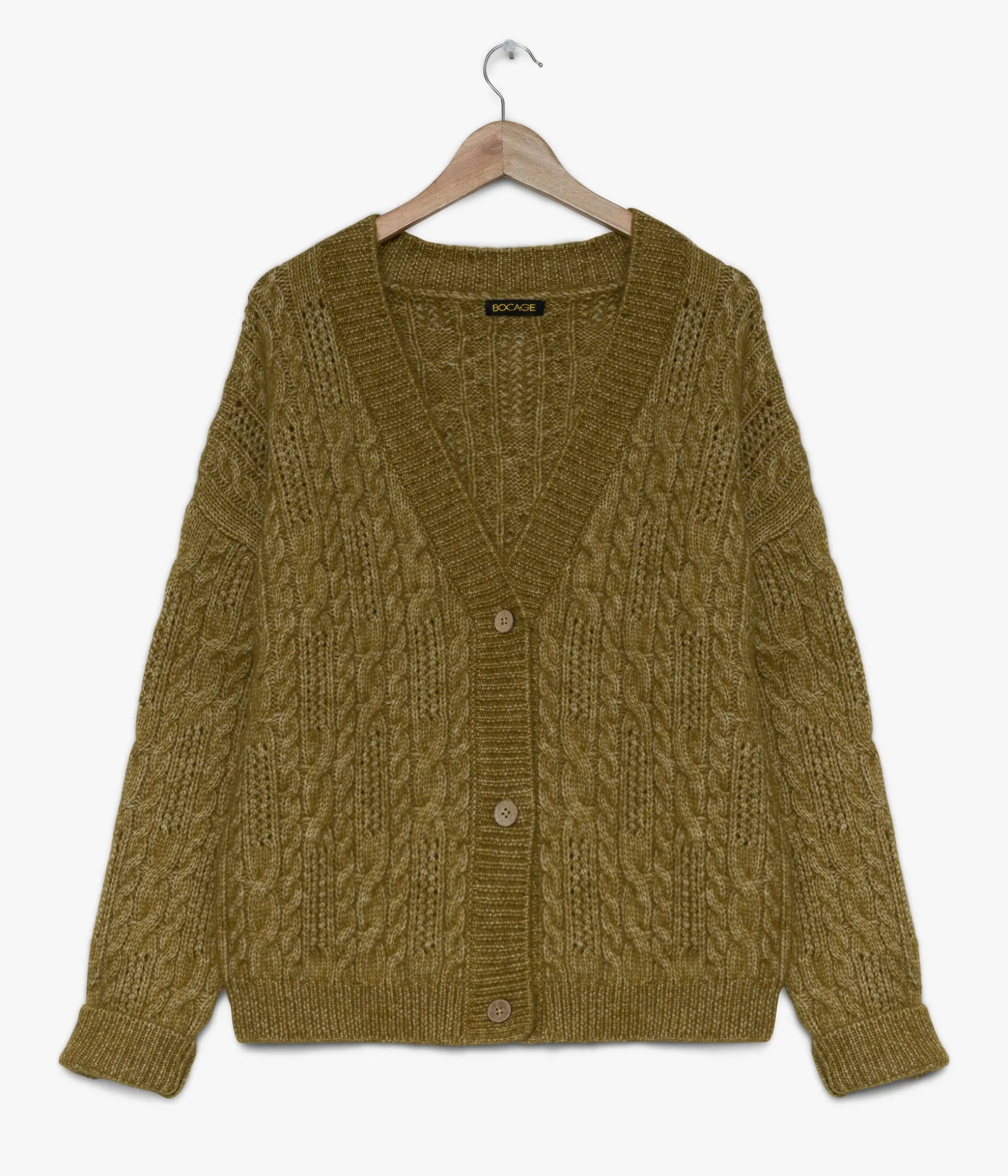 Un gilet vert en maille torsadée particulièrement confortable grâce à sa coupe ample et ses épaules tombantes. Ce gilet à col V est confectionné dans une grosse maille contenant 30% de laine pour offrir plus de chaleur. Il se ferme par trois boutons aspect bois. Finitions bord-côte. Longueur : 60 cm. Disponible en 2 tailles.
