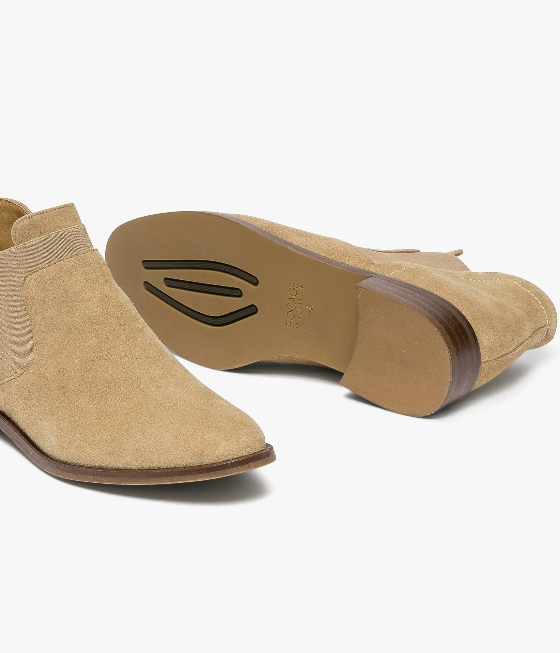 Un low-boots couleur sable en cuir velours fabriqué avec soin dans notre propre atelier en France, au cœur du Maine et Loire (49). Cette chaussure assure élégance et confort avec son bout amande et sa large bande élastique pailletée sur l’avant inspirée des Chelsea. Une chaussure entièrement doublée cuir avec semelle intérieure cuir dotée d’une fine mousse. Elle repose sur une semelle fine avec trépointe cuir et large talon lamellé collé. Notre technologie Bocage Innovation vous garantit un bien-être inégalé. La semelle dissimule des élastiques qui permettent à votre chaussure de s’adapter à votre pied.