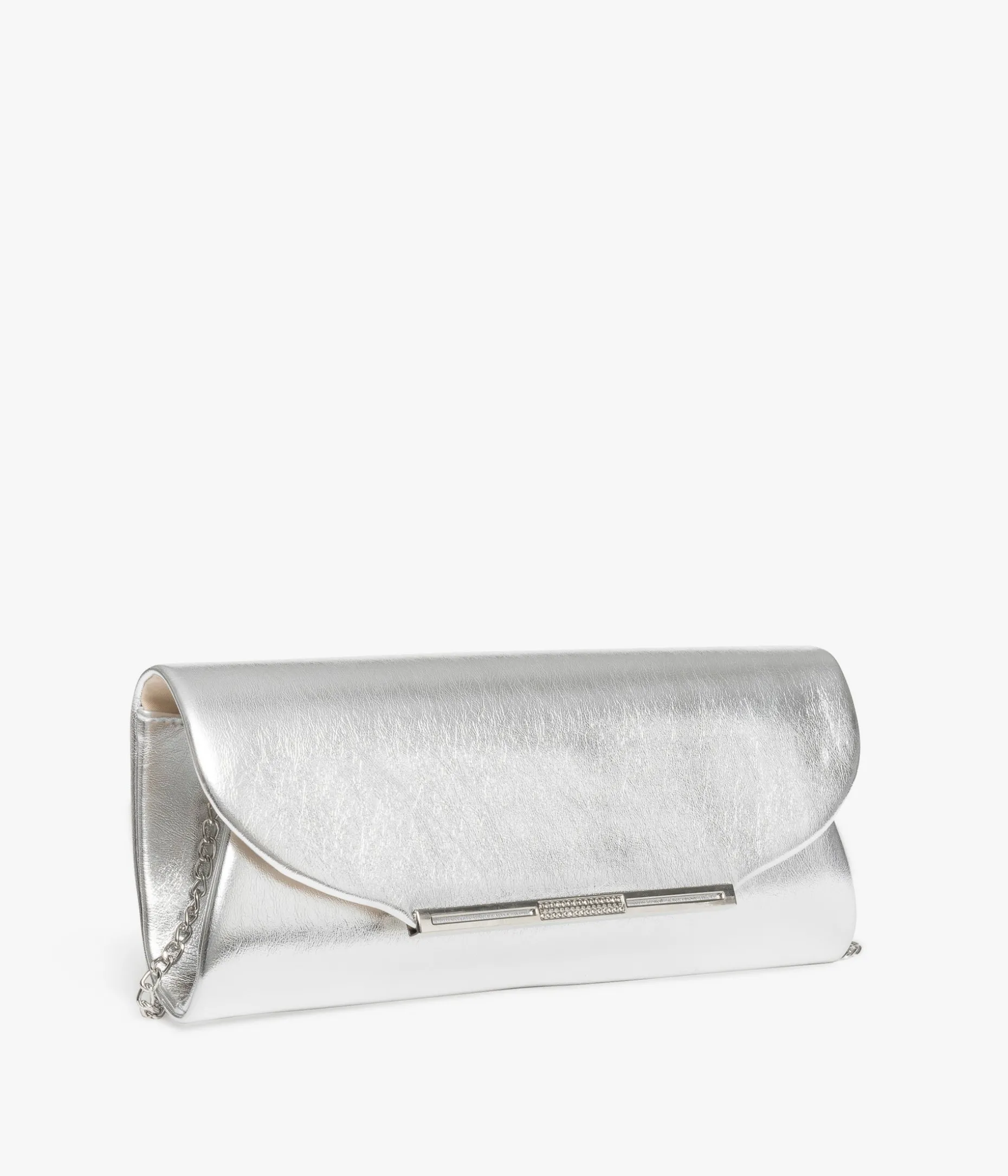 Une pochette de soirée argentée particulièrement élégante avec sa forme enveloppe allongée. Son rabat, agrémenté d’une barrette argentée et de strass, se ferme à l’aide d’un bouton aimanté et se porte sur l’épaule grâce à une bandoulière chaine amovible qui peut être remplacée par une bandoulière fantaisie. Elle possède un compartiment et une poche plaquée. Ce sac de cérémonie est entièrement doublé d’une toile en polyester recyclé. Dimensions : H11 x L27 x P5 cm. Anses 53 cm.