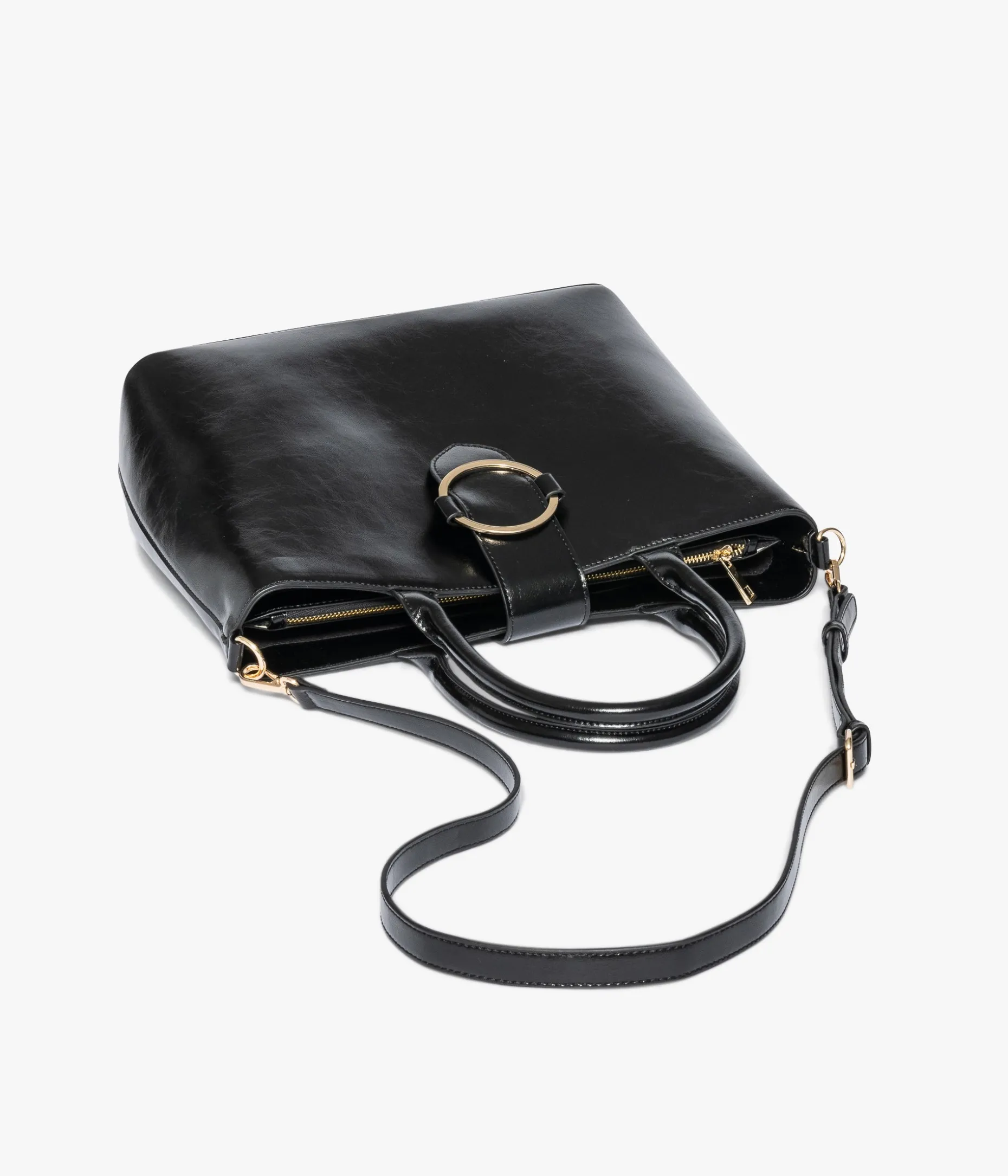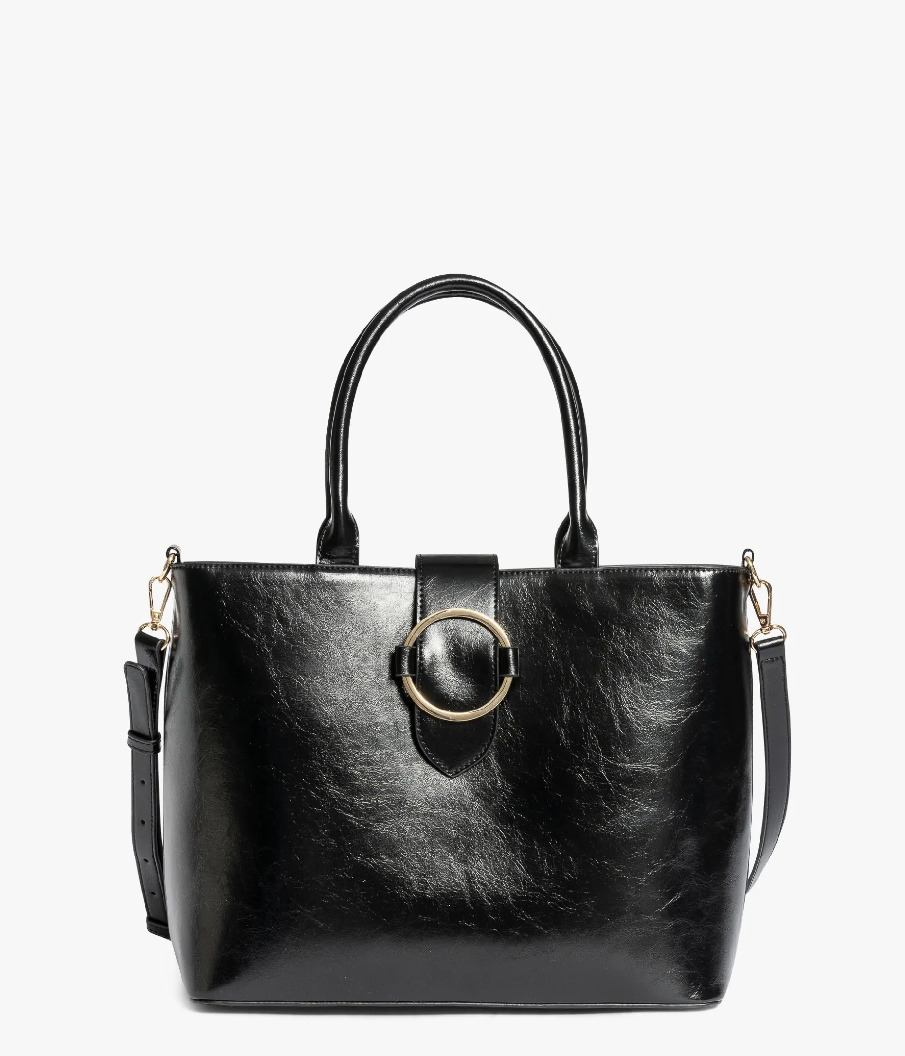 Un sac cabas noir confectionné dans une matière au fini brillant et fermé par une large bride ornée d’un anneau en métal doré. Un sac au format idéal pour transporter des dossiers professionnels ou une tablette. Ce sac possède une doublure en polyester recyclé et offre trois compartiments dont un zippé, une pochette zippée et deux poches plaquées. Ce sac offre un double porté, porté main grâce à des anses rigides et porté épaule avec une bandoulière amovible réglable en longueur. Dimensions : H27 x L36 x P12 cm. Anses : 17 cm.