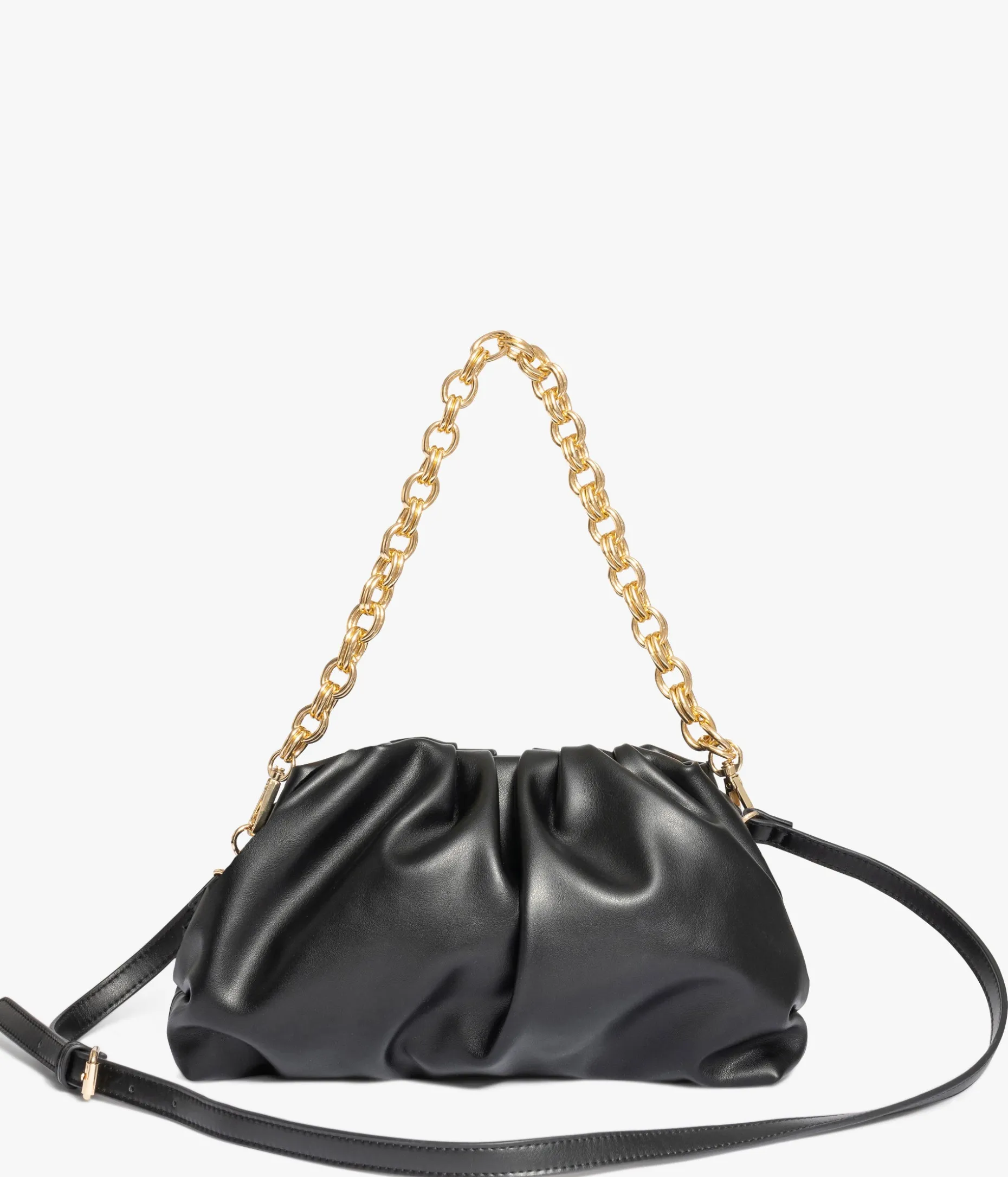 Un très joli sac noir qui ajoutera une touche de sophistication discrète et moderne, inspirée de l'esthétique nordique aux tenues du quotidien comme aux tenues de soirée. Confectionné dans une matière synthétique ultra souple, ce sac possède affiche un bel effet drapé au niveau de la fermeture. Cet élégant sac pour femme s’utilise également comme sac de cérémonie. Il possède deux bandoulières, l’une courte en chaine dorée pour un porté sur le bras, l’autre ton sur ton pour un porté épaule ou croisé. Bandoulières avec mousquetons. Fermeture porte-monnaie dissimulée à l’intérieur. Un compartiment, une poche plaquée, une pochette zippée. Dimensions : H18 x L30 x P5 cm. Bandoulière 20 cm et 50 cm environ. Doublure polyester recyclé.