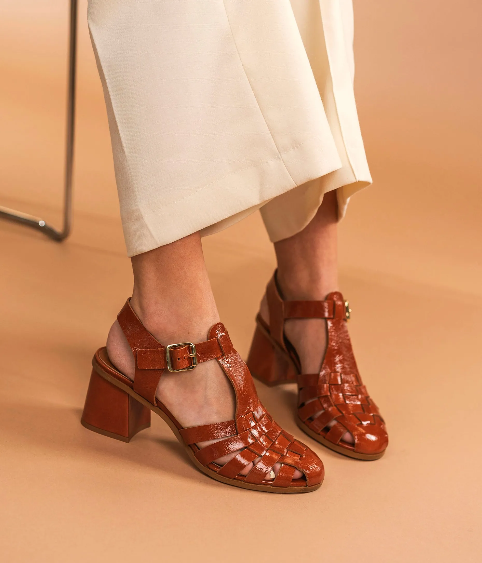 Une sandale en cuir verni cognac fabriquée avec le plus grand soin. Une jolie sandale « Fisherman » à talon avec brides entrecroisées sur le dessus du pied, ouverte sur l’arrière. Elle se ferme grâce à une boucle carrée en métal doré. Son cuir Naplak à l’aspect légèrement froissé et son talon positionné en retrait lui confèrent une allure rétro. Une chaussure entièrement doublée cuir avec semelle intérieure cuir dotée d’une fine mousse.
