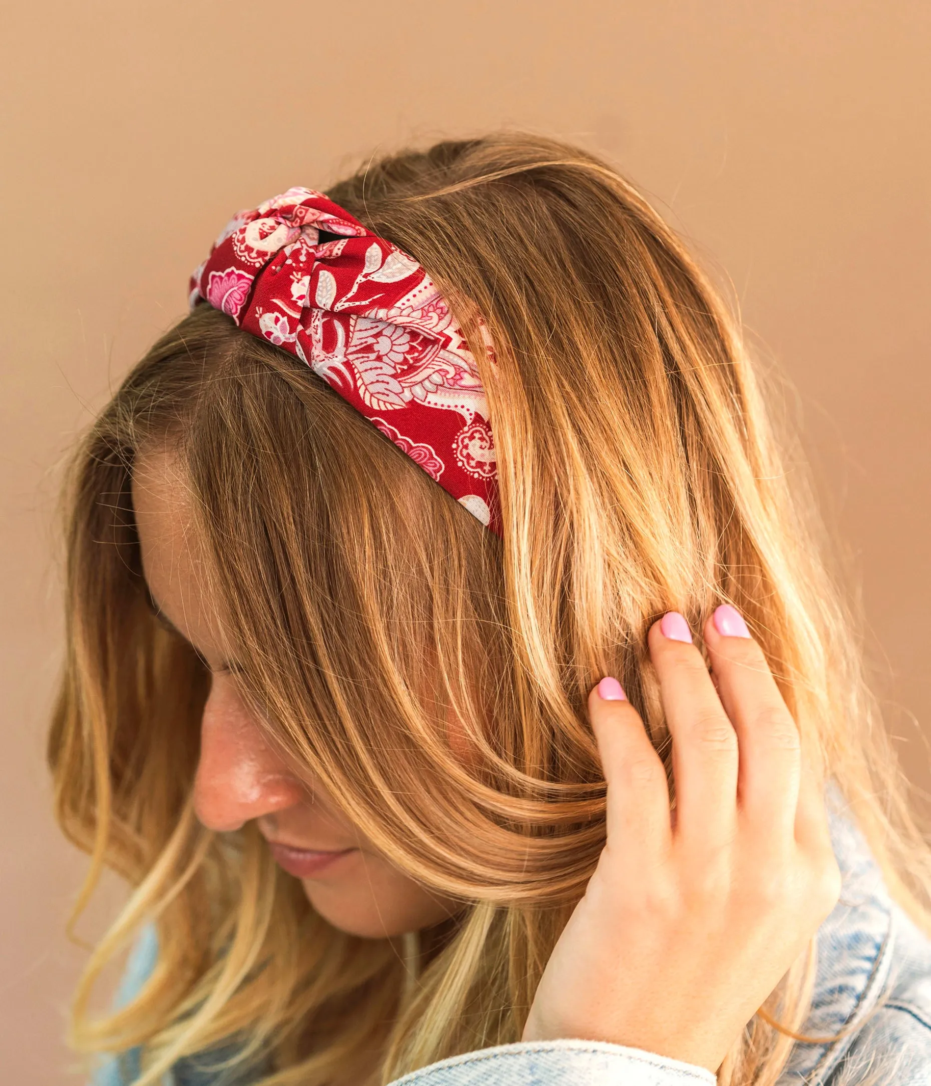 Un serre-tête rouge idéal pour ajouter une touche bohème à votre look. Un serre-tête en tissu orné de jolis motifs cachemire roses et blancs avec nœud sur le dessus. Ses couleurs pétillantes permettent d’illuminer toutes les couleurs de cheveux. Armature en plastique. Embouts protégés pour plus de confort.